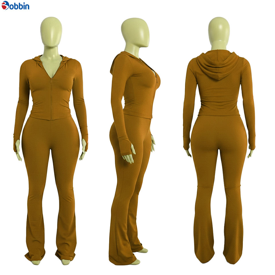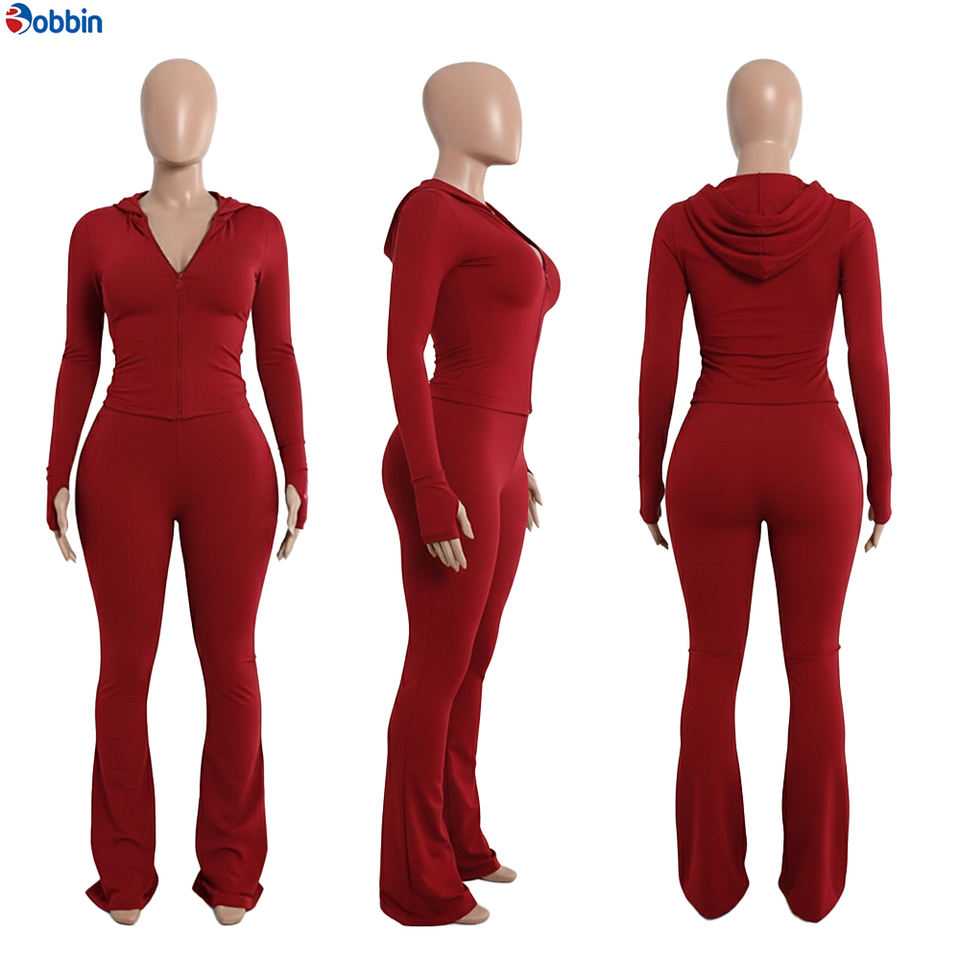 ชุดเซ็ตสเวตสูทสีแดงไซส์พลัสสำหรับผู้หญิงมาใหม่ พร้อมซิปปรับแต่งได้ เสื้อฮู้ดดี้และกางเกงขาบานสไตล์ฮิปฮอป