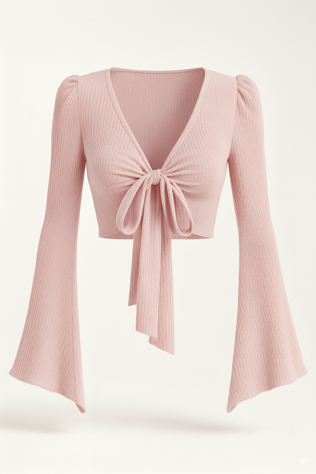 เสื้อครอปไหมพรมถักลายริบ ผูกด้านหน้า แขนยาว สไตล์ลำลอง สตรีทแวร์ รุ่นใหม่ ผลิตจากวัสดุรักษ์โลก