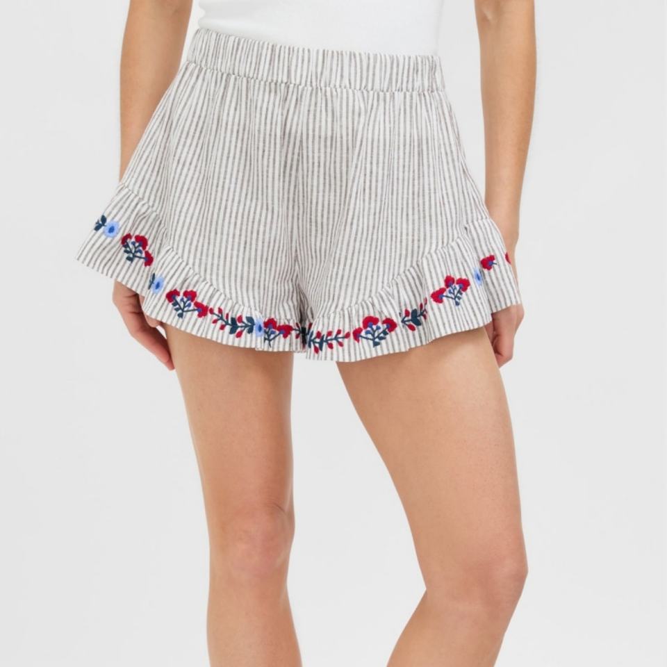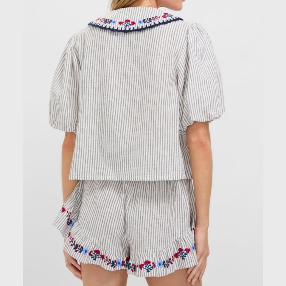 ชุดเซ็ตสองชิ้นลายทางสำหรับผู้หญิงมาใหม่ เสื้อปักลายแขนพองทรงหลวมใส่สบายและกางเกงขาสั้นเข้าชุด