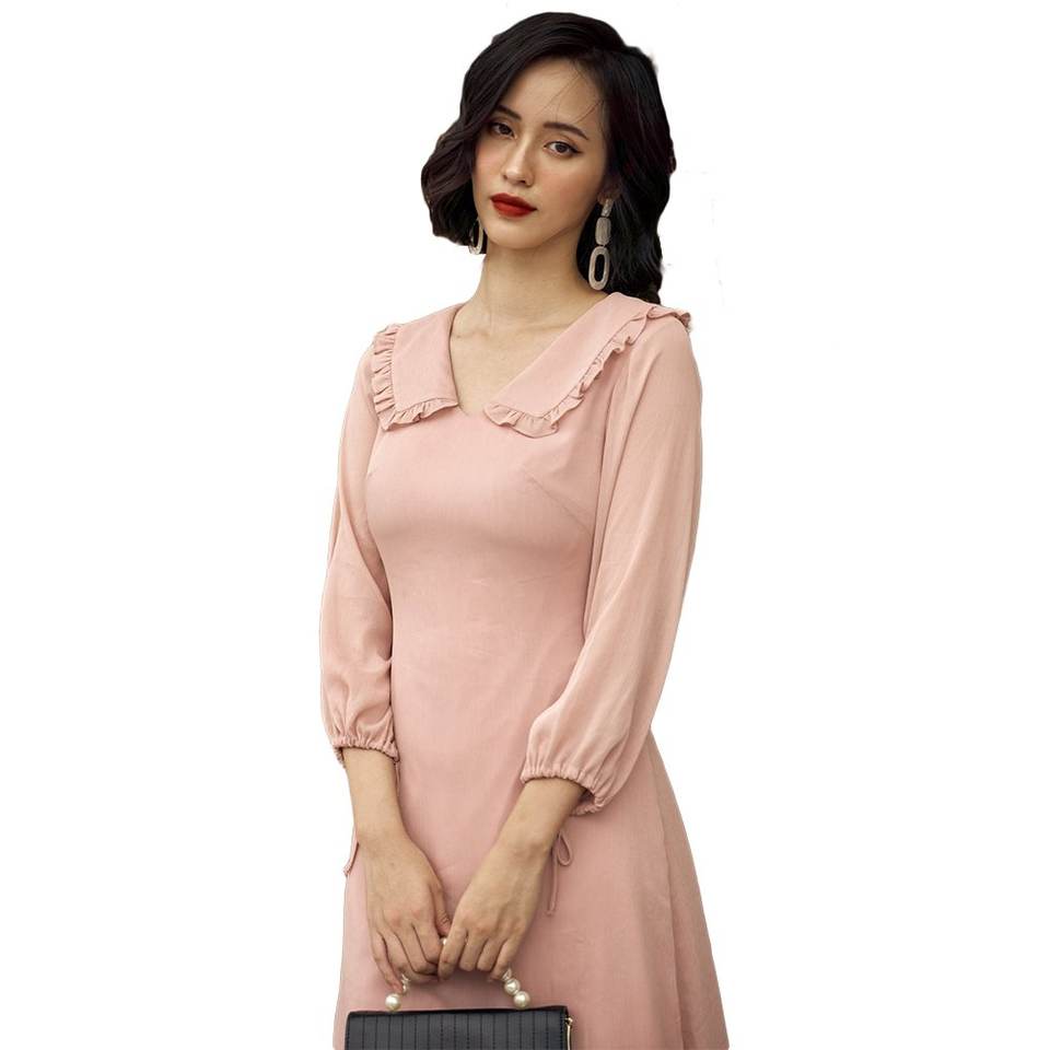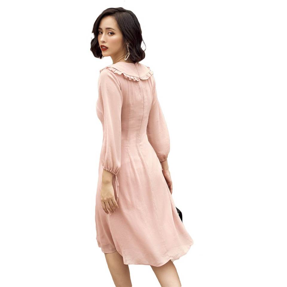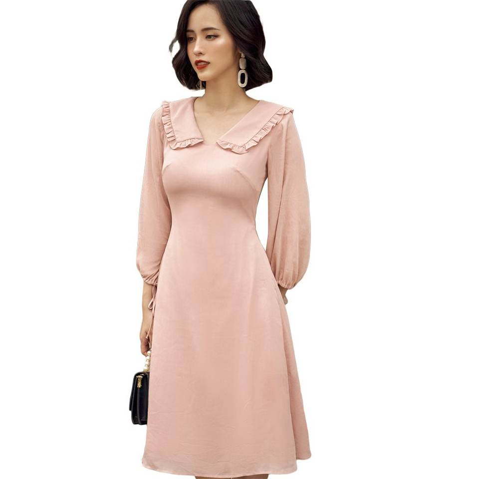 เดรสมิดิชีฟอง2020สีพื้นมีซิปสำหรับผู้หญิงสไตล์วินเทจแขนยาวคอพับลงทำจากเวียดนามสินค้าออกใหม่