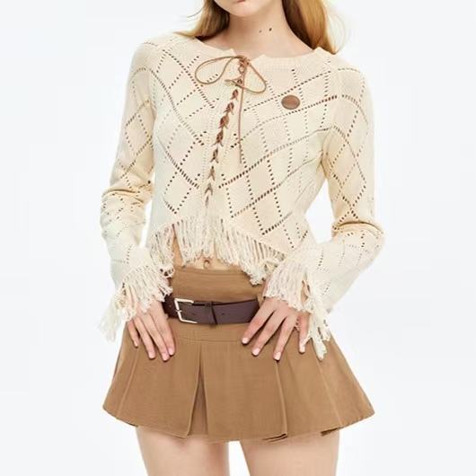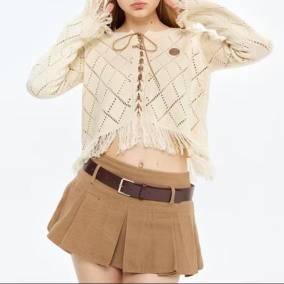 คาร์ดิแกนแฟชั่นสำหรับผู้หญิงเสื้อสเวตเตอร์ถักแบบมีเชือกรูดคอกลมหวานใหม่
