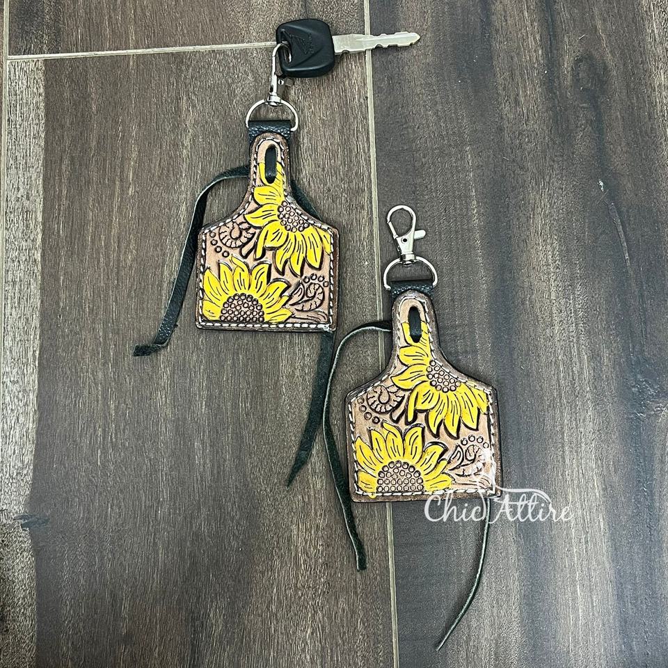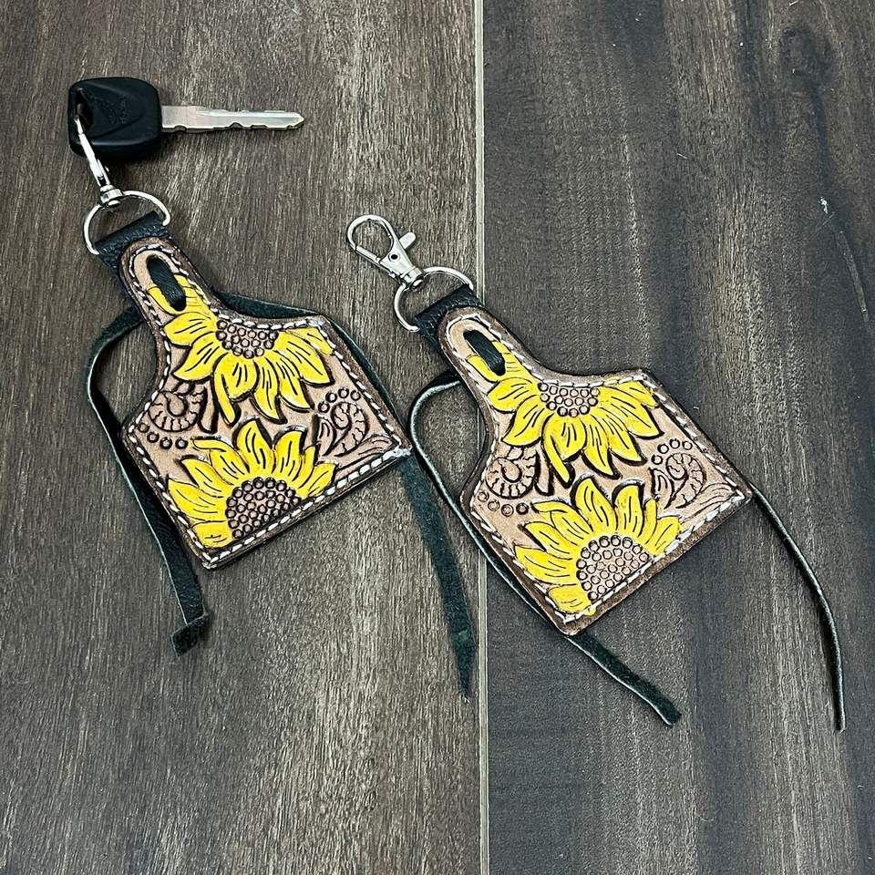 พวงกุญแจหนังแท้ลายดอกทานตะวัน สไตล์ตะวันตก งานแฮนด์เมด พร้อมพู่หนังวัว