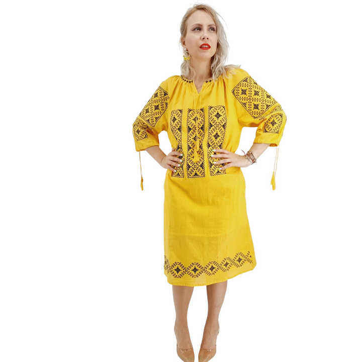 ชุดเดรสสั้นปักแขน3/4สำหรับผู้หญิงชุดเดรสสั้นผ้าเรยอนปักลายสีเหลืองสไตล์ใหม่