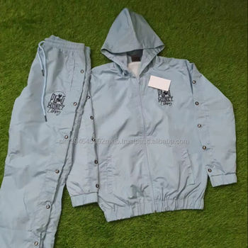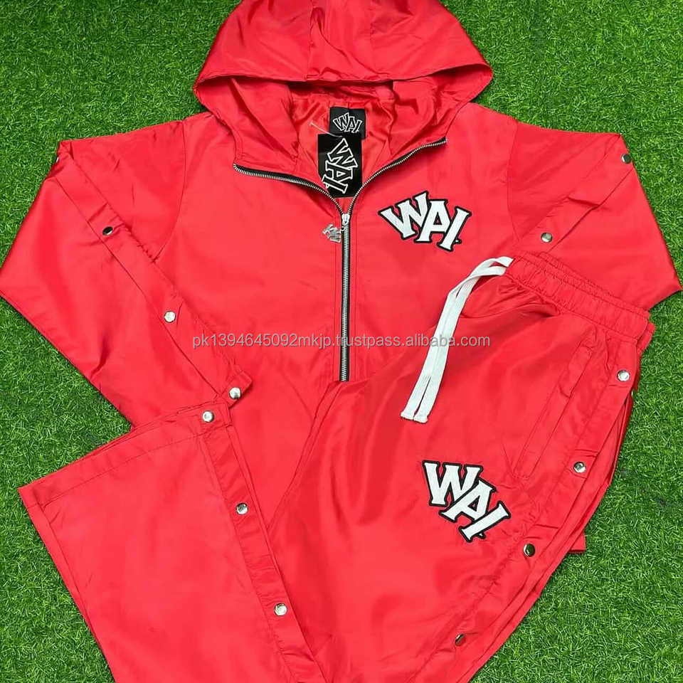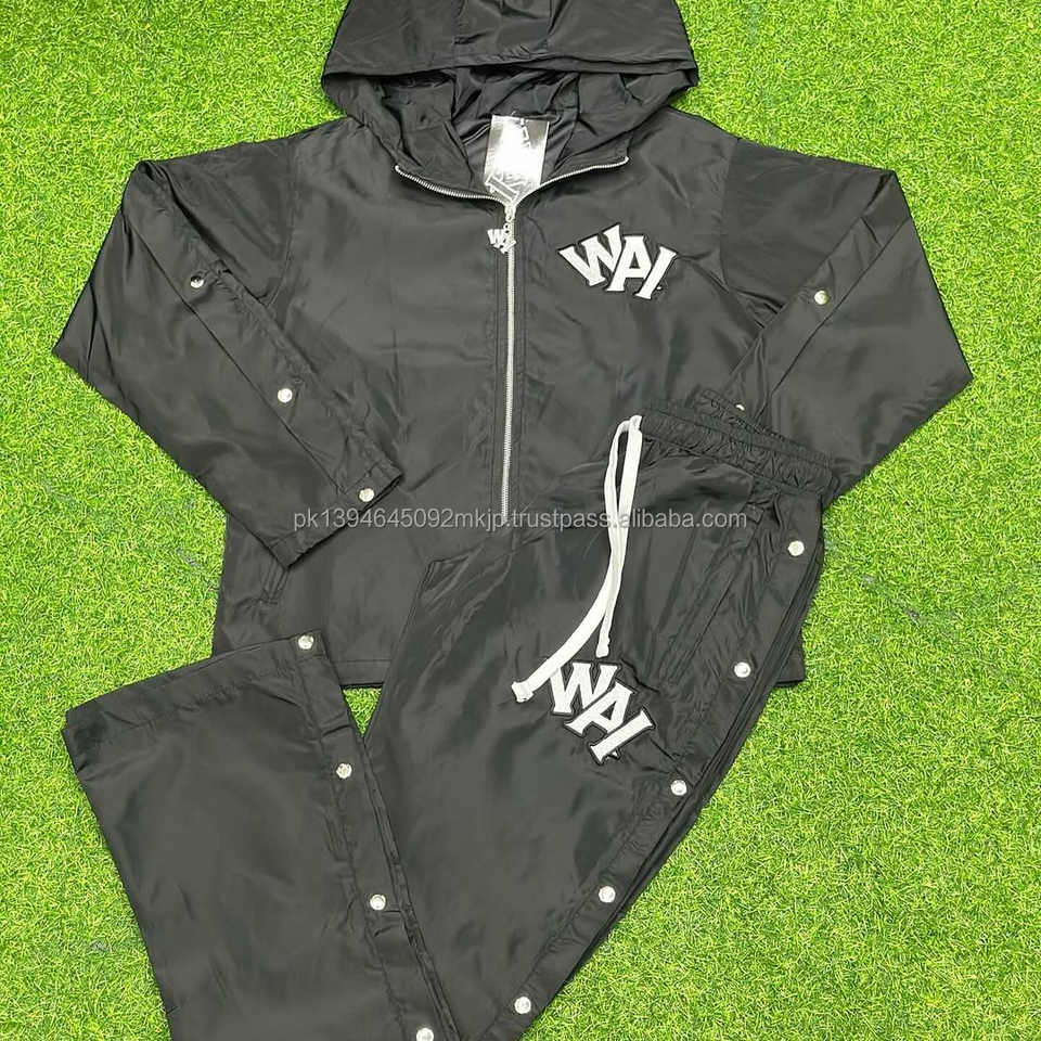 ชุดวอร์มไนลอนแบบใหม่พร้อมกระดุมด้านข้าง ชุดวอร์มไนลอนกันลมพร้อมโลโก้ DTF ชุดเซ็ต 2 ชิ้น ชุดวอร์มไนลอนกันลมสำหรับผู้ชาย