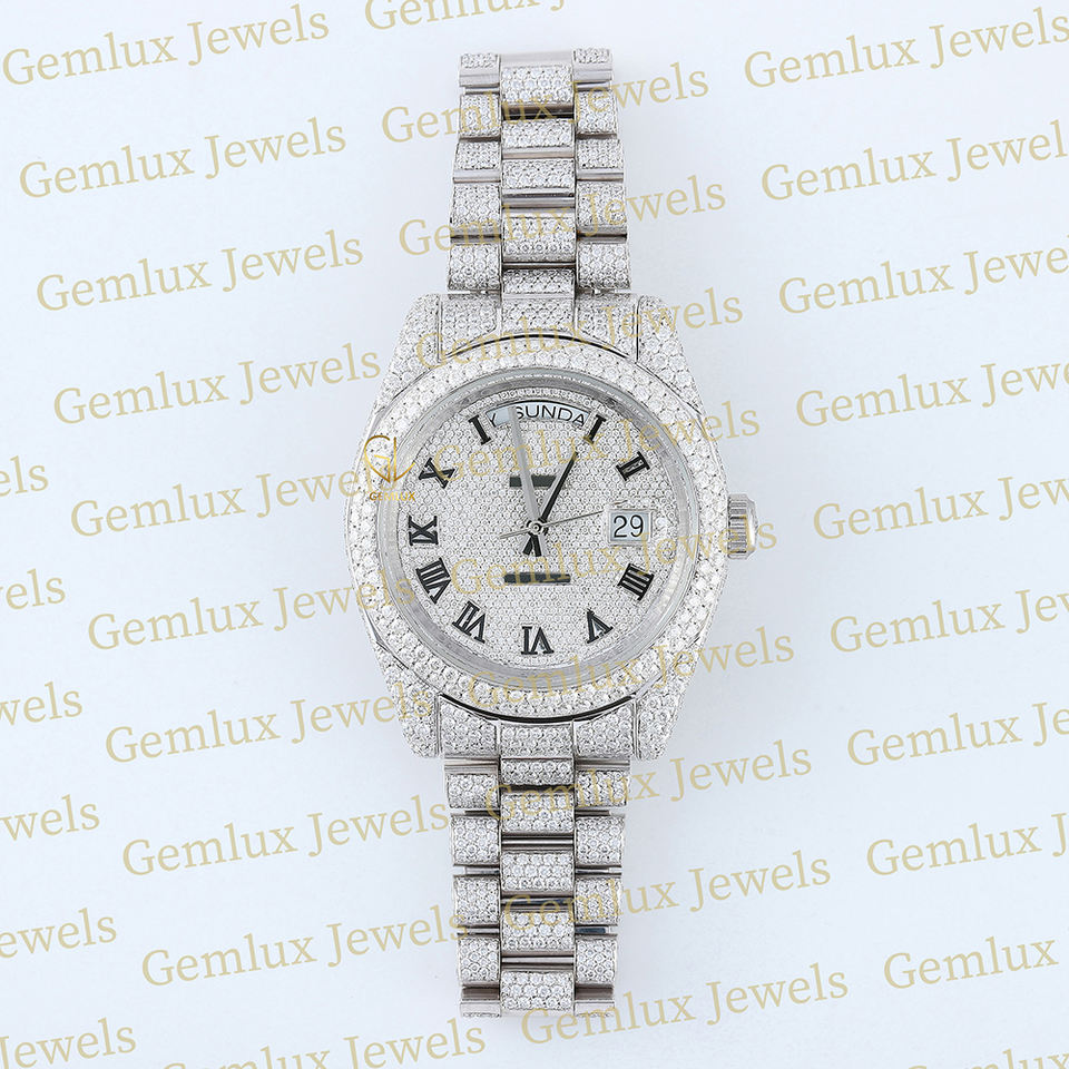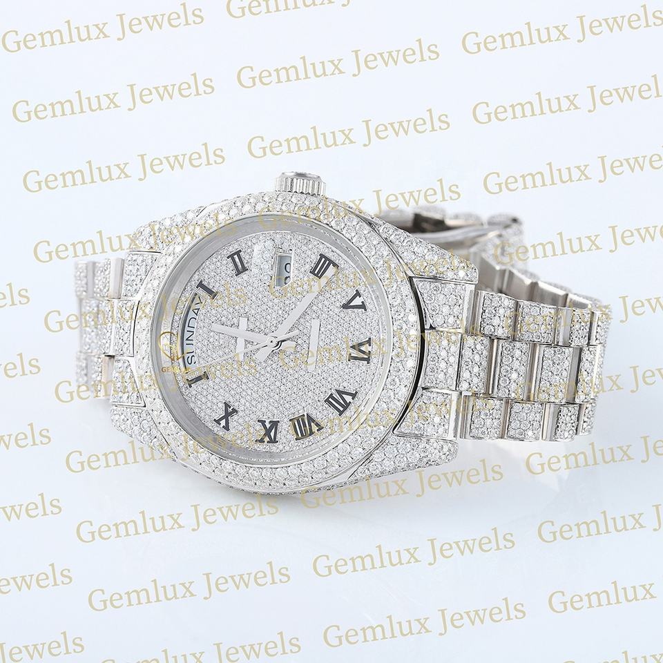 นาฬิกาเพชรหน้าปัดโรมันหน้าปัดเพชรสีขาวประดับเพชรสายสแตนเลส