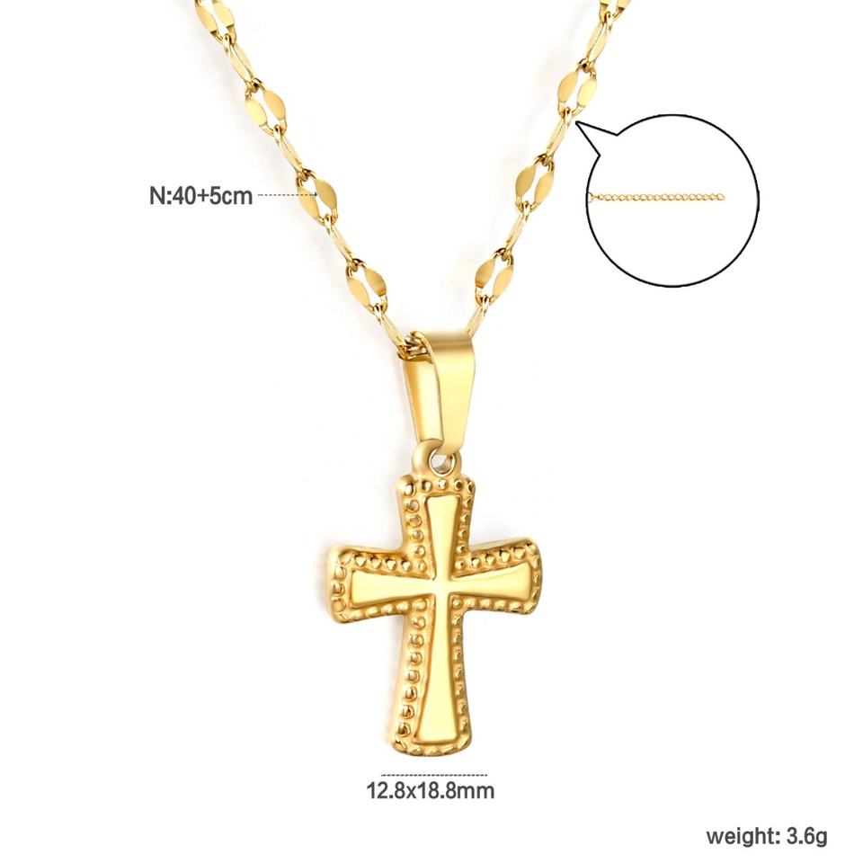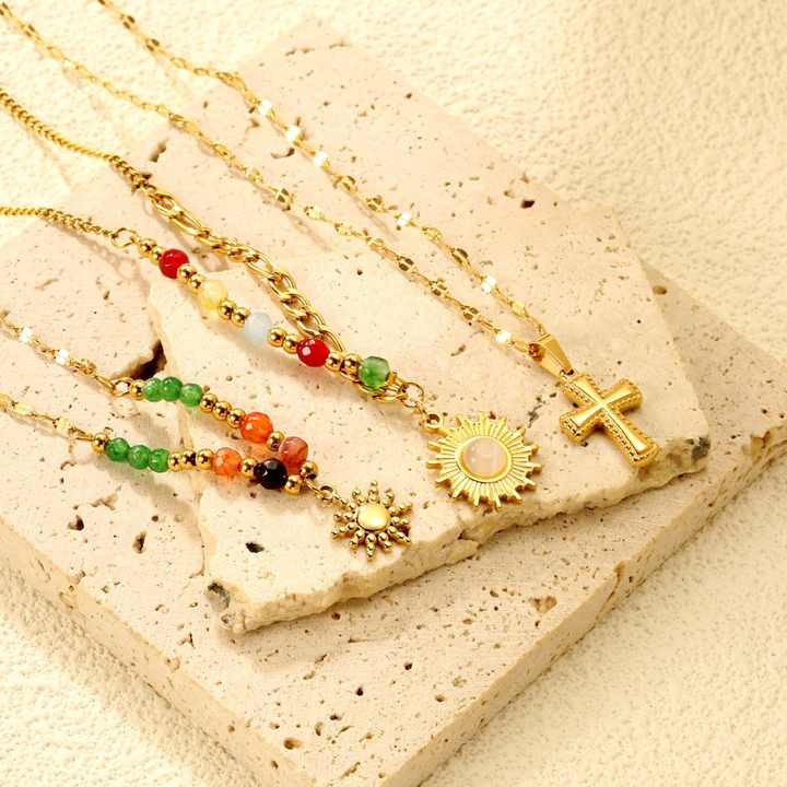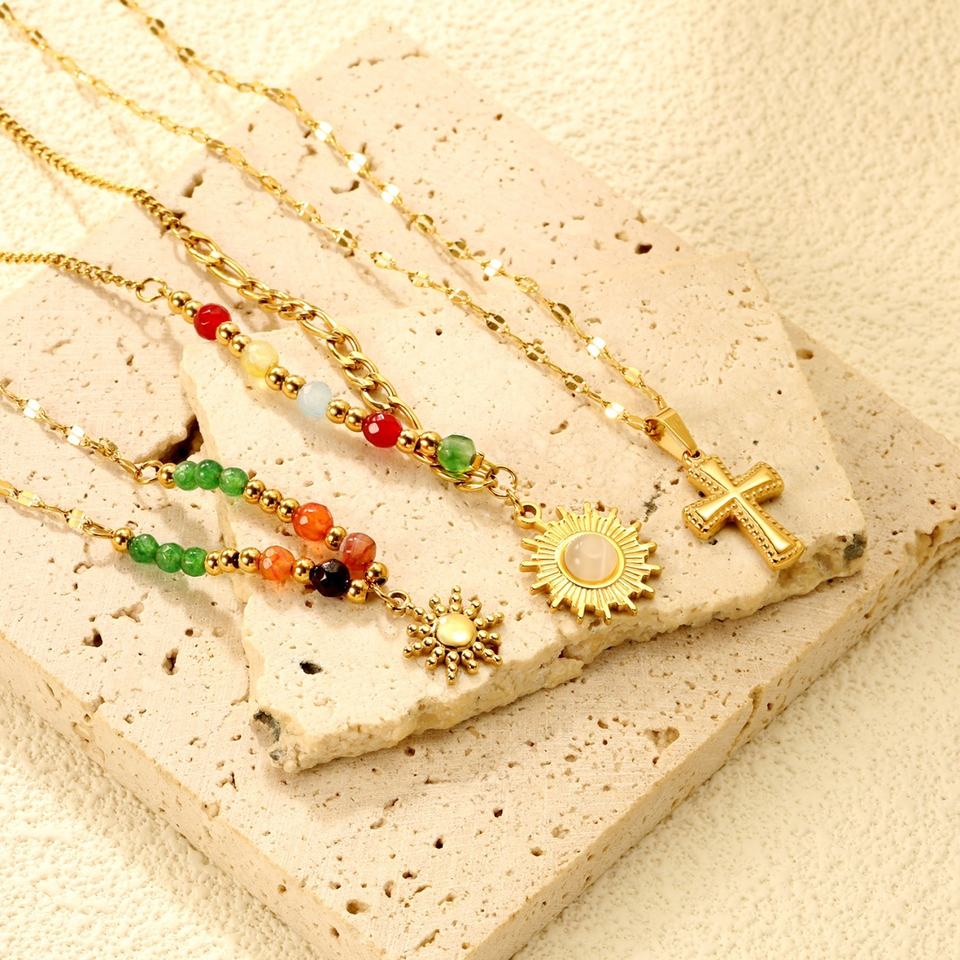 สร้อยคอจี้พระอาทิตย์ประดับลูกปัดหินธรรมชาติหลากสีสัน สแตนเลสสตีลชุบทอง 18K ดีไซน์สวยหรู พร้อมจี้กางเขน