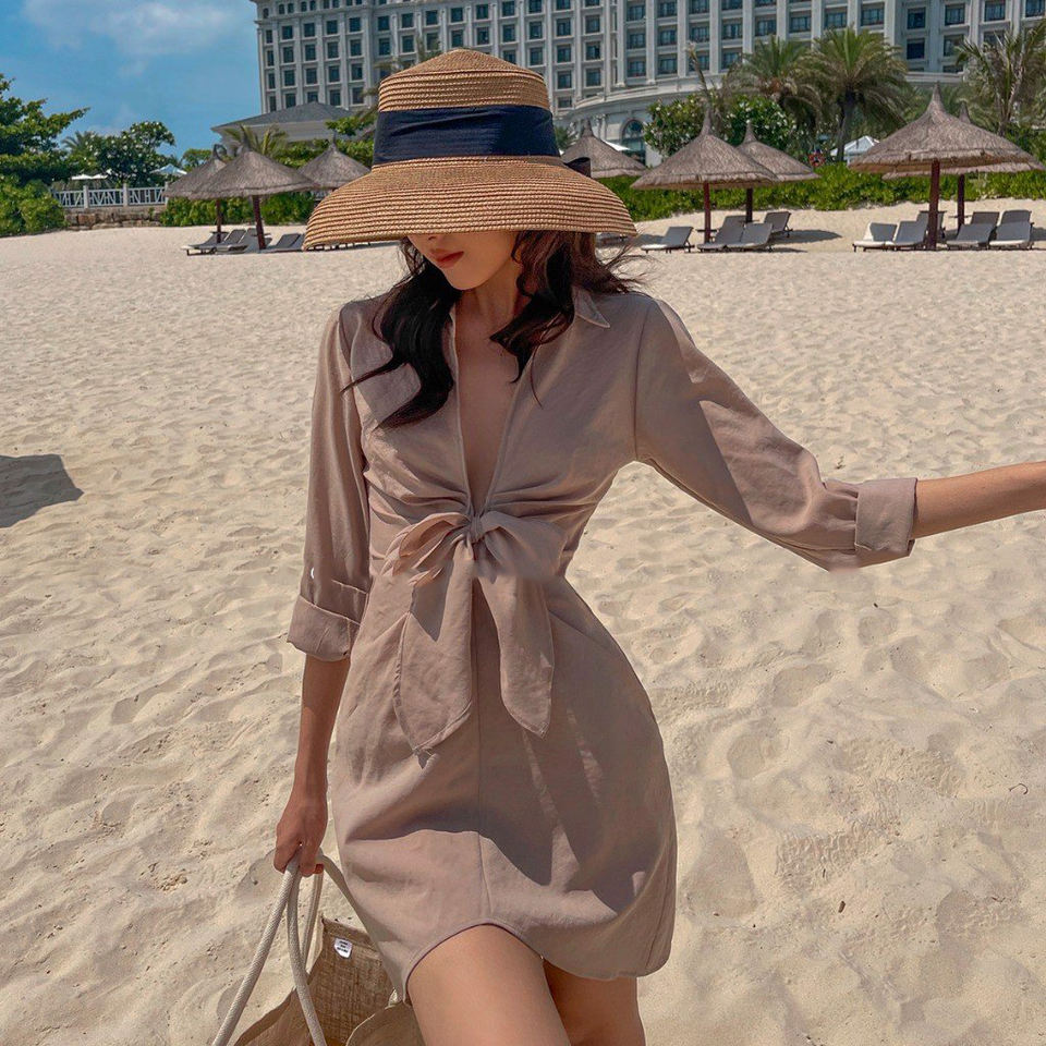 เข้ามาใหม่เสื้อเชิ้ตสีขาวชุดผู้หญิงแขนยาวชุดสุภาพสตรีสำนักงานลึกคอวีมินิเดรสลำลอง