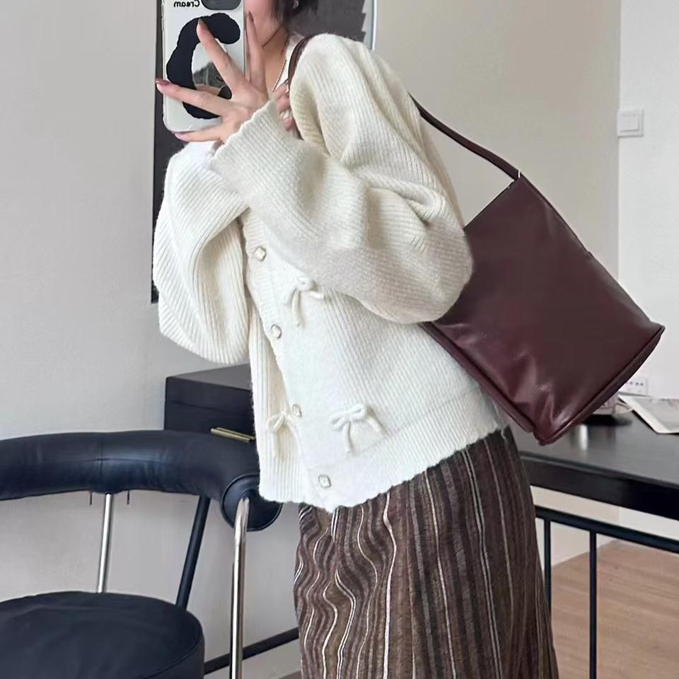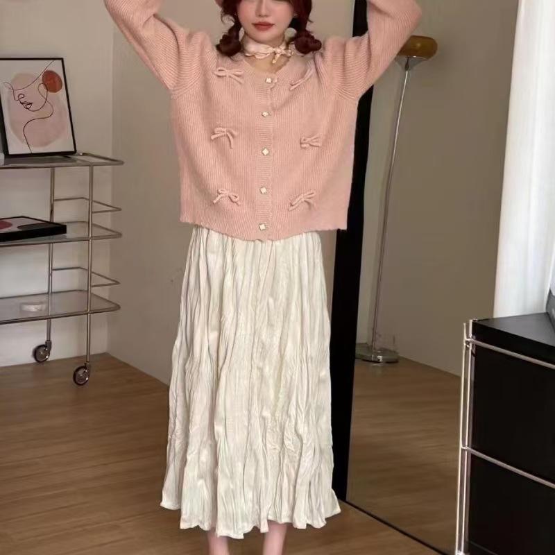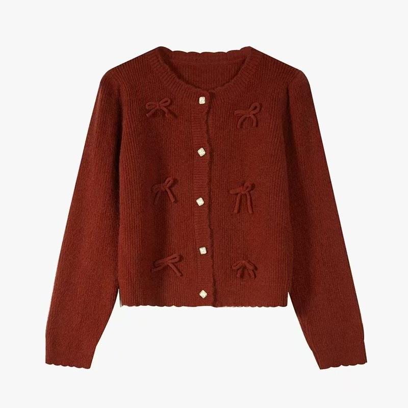 คาร์ดิแกนขนสัตว์ตัวยาวของผู้หญิงมาใหม่ผูกโบว์หวานสีทึบสไตล์ลำลองฤดูใบไม้ร่วงฤดูหนาวตกแต่งกระดุม