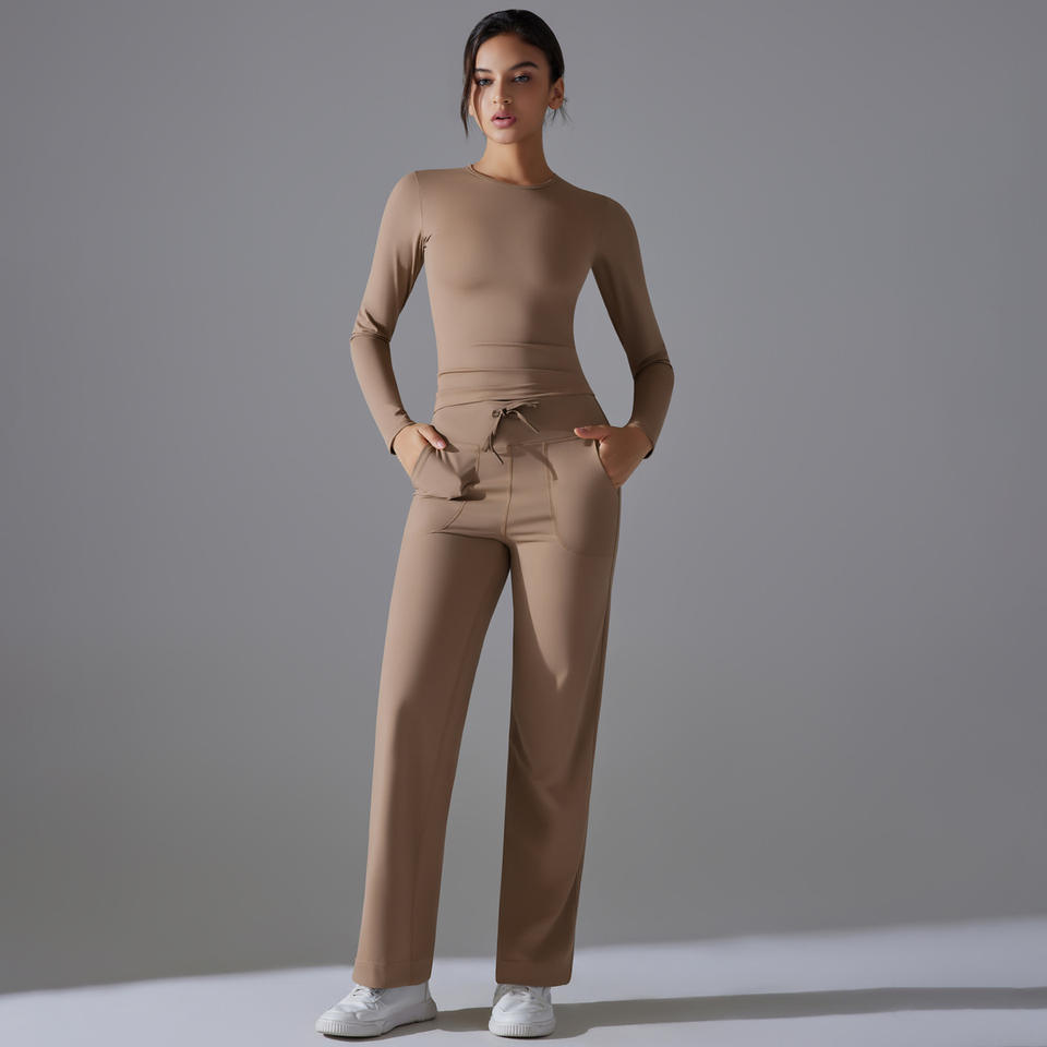 ชุดโยคะผู้หญิงแบบ 2 ชิ้น แขนยาวทรงเข้ารูป คอวี ไหล่เดียว ผ้าเนื้อเดียว ป้องกันแบคทีเรีย สำหรับฤดูใบไม้ร่วงและฤดูหนาว รุ่นขากว้างทรงบานเล็กน้อย