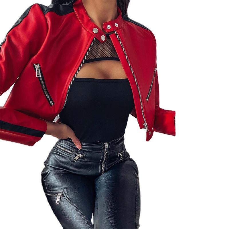 New Autumn Zipper Embroidered Cow Skin Motorcycle Jacket Women Regular Eco-Friendly Waterproof Black Red Ladies Street Coat