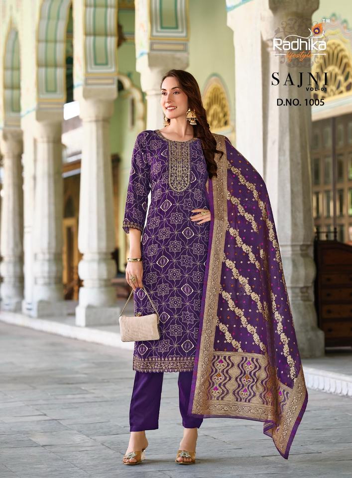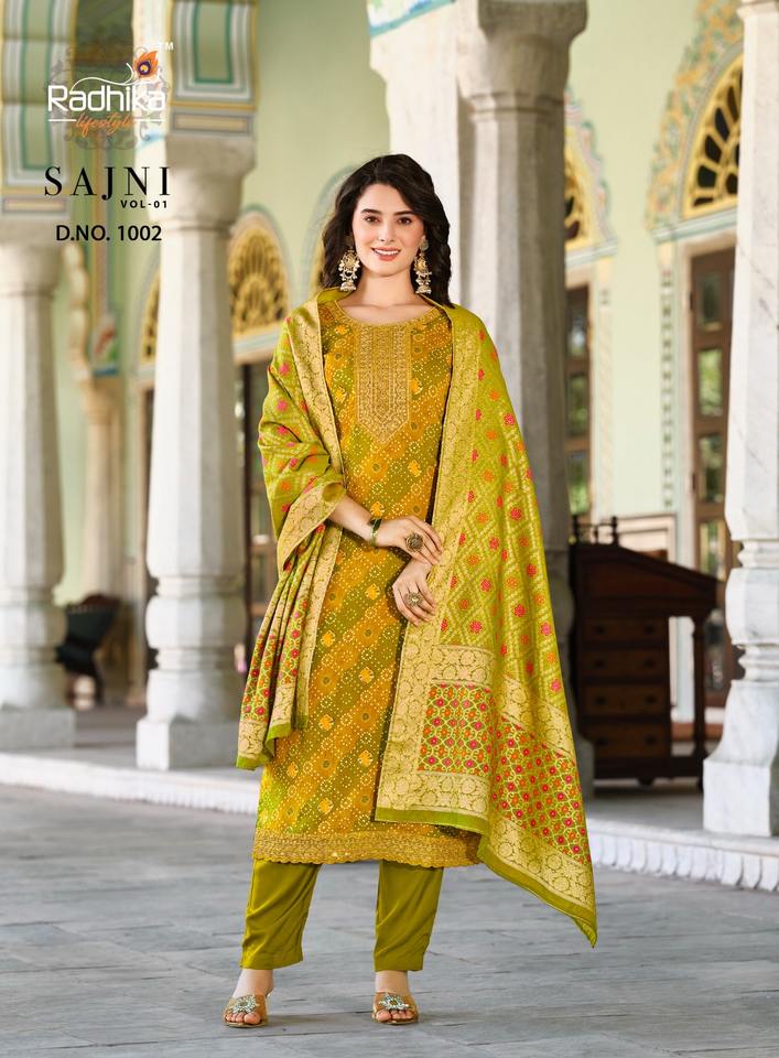 ชุดเสื้อและกางเกงผ้าแจ็คการ์ดพิมพ์ลาย Bandhej ดั้งเดิมใหม่สำหรับงานแต่งงานมีให้เลือกทุกขนาด