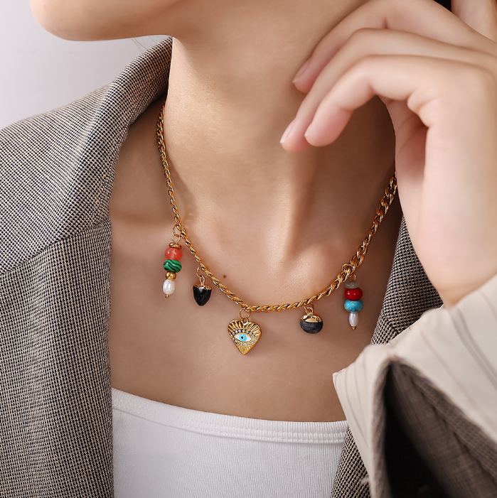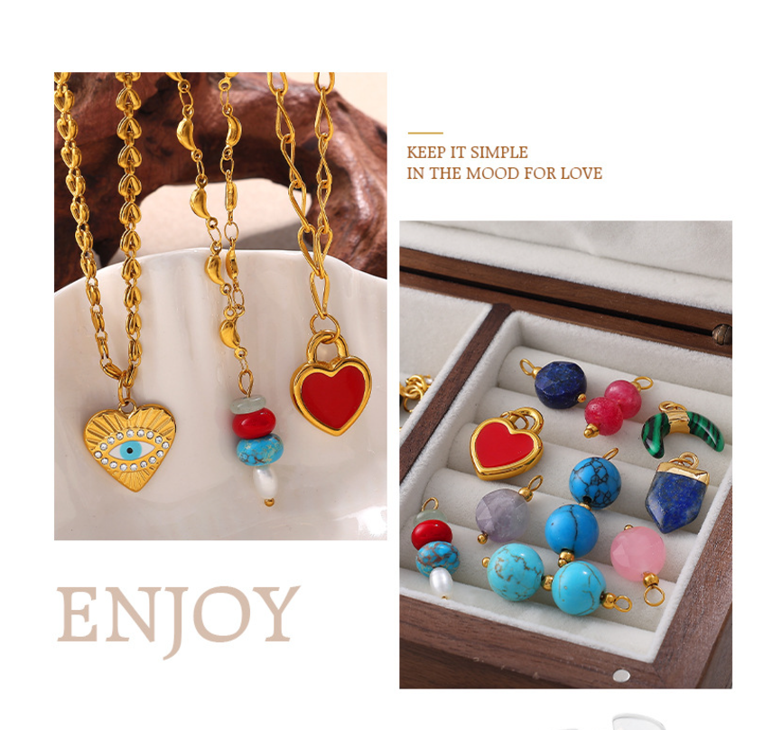 จี้ห้อยคอรูปหัวใจทำจากหินธรรมชาติสีสันสดใสสำหรับวันหยุดชายหาดสไตล์วันหยุดทำจากสแตนเลส