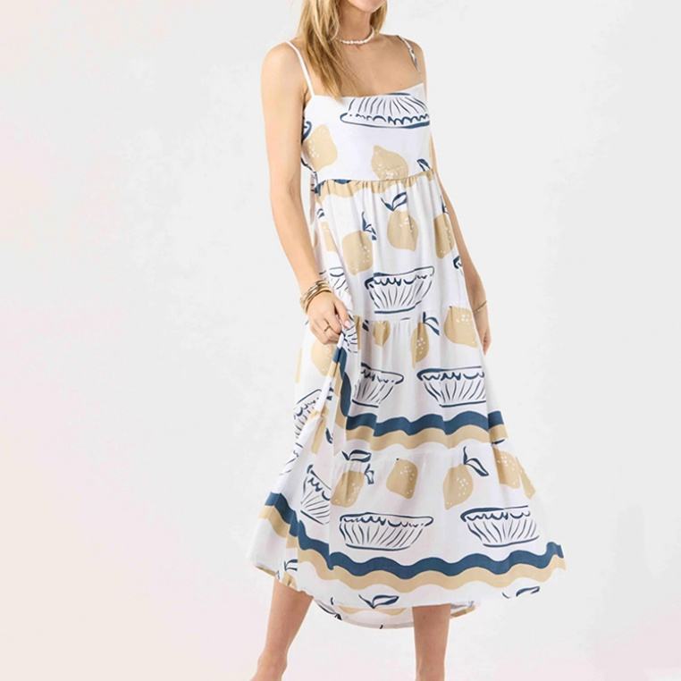 เดรสยาวพิมพ์ลายชายหาด คอเหลี่ยม ดีไซน์เปิดหลังผูกเชือก ผ้าเรยอน 100% ปรับแต่งได้