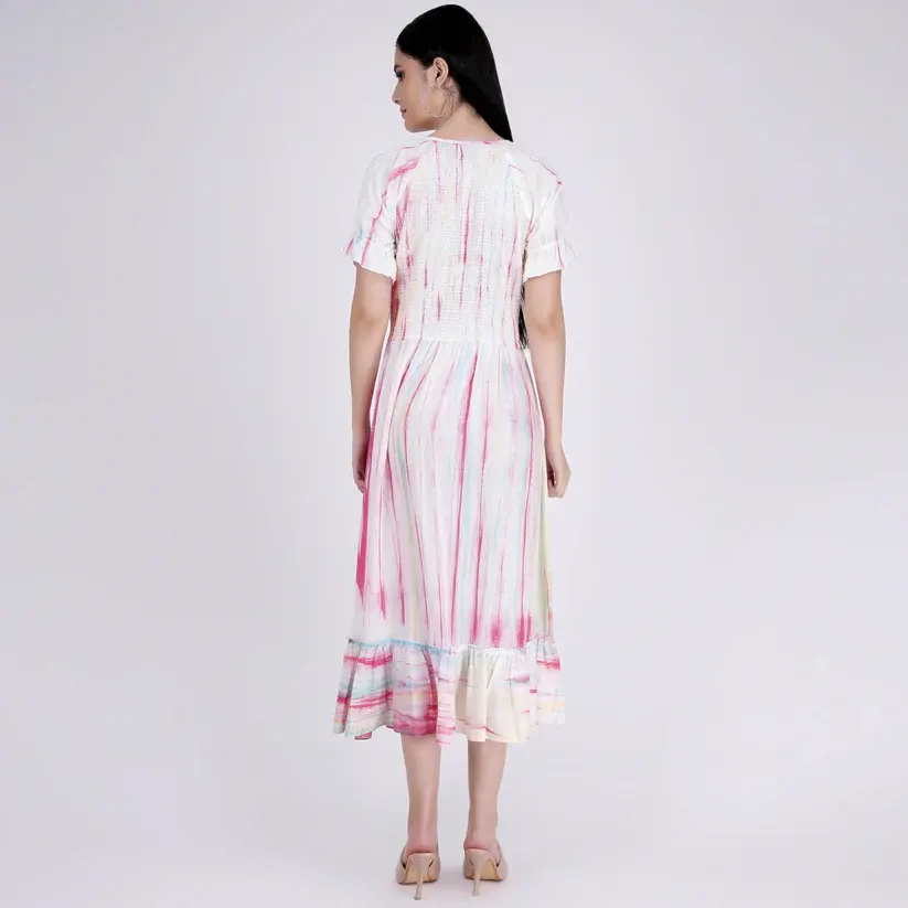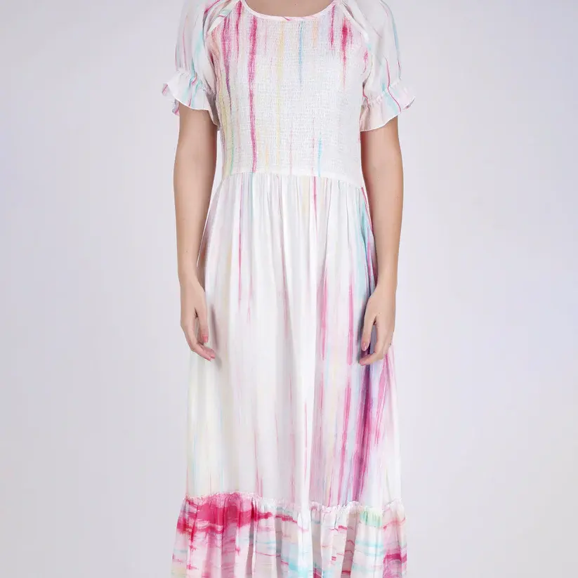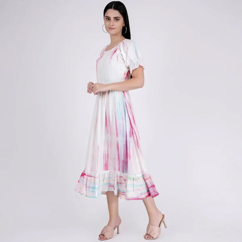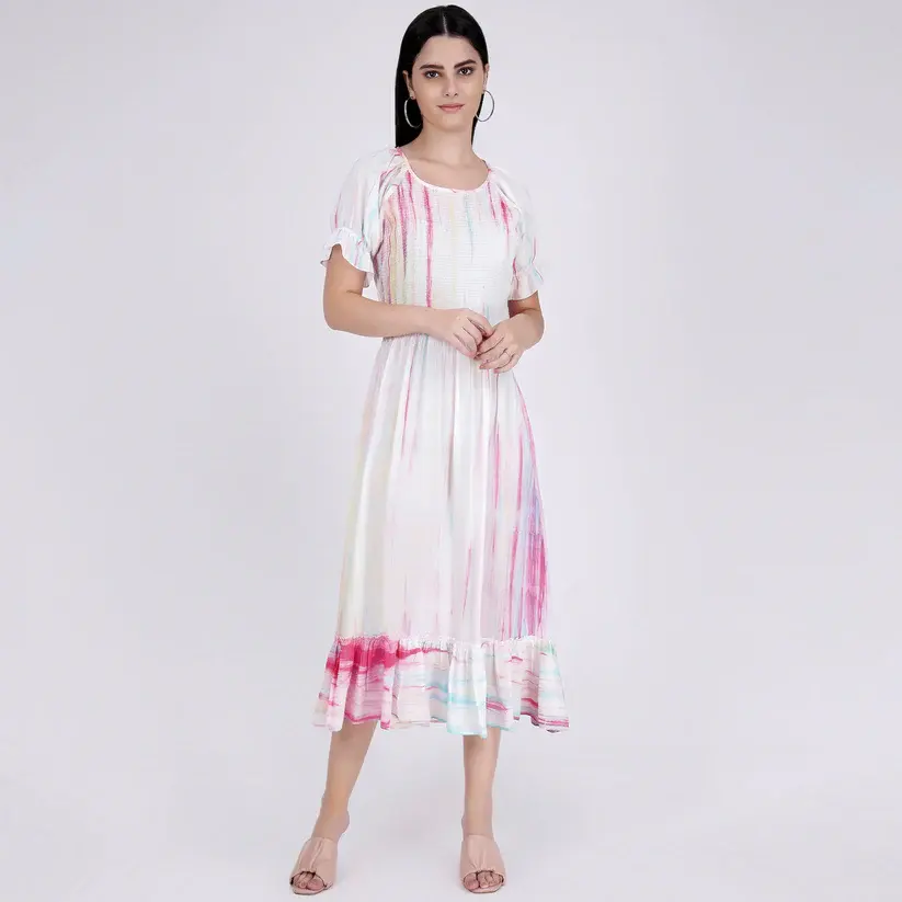 New Beautiful Bright Color Rayon Tie-Dye Summer Beach and Resort Wear Dress for Women With Round Neck, Short Sleeve Dress