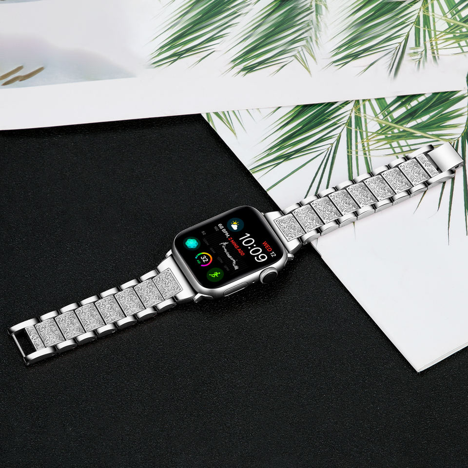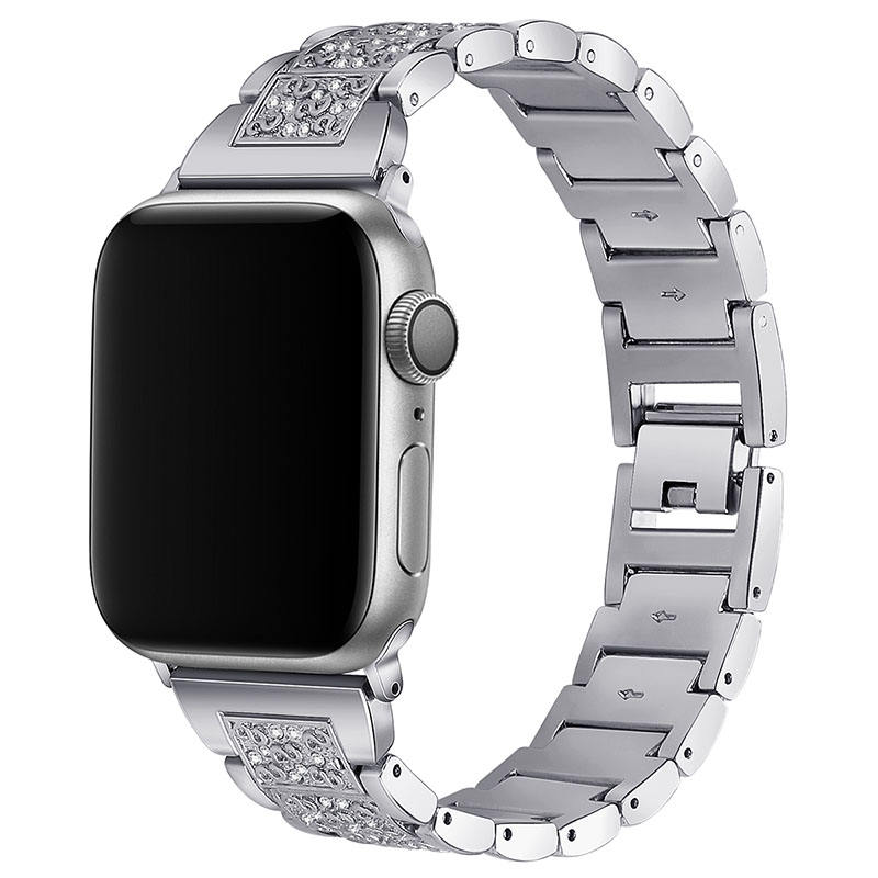 สายนาฬิกาข้อมือแบบคลาสสิกสวยงามใหม่ สายโลหะสแตนเลสแบบสามเม็ดประดับเพชร สำหรับ Apple Watch