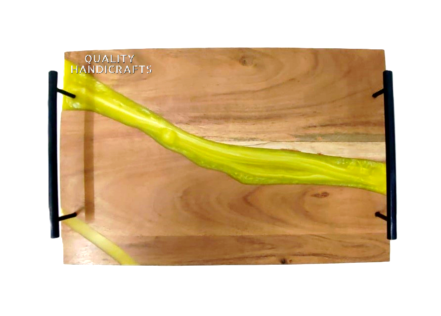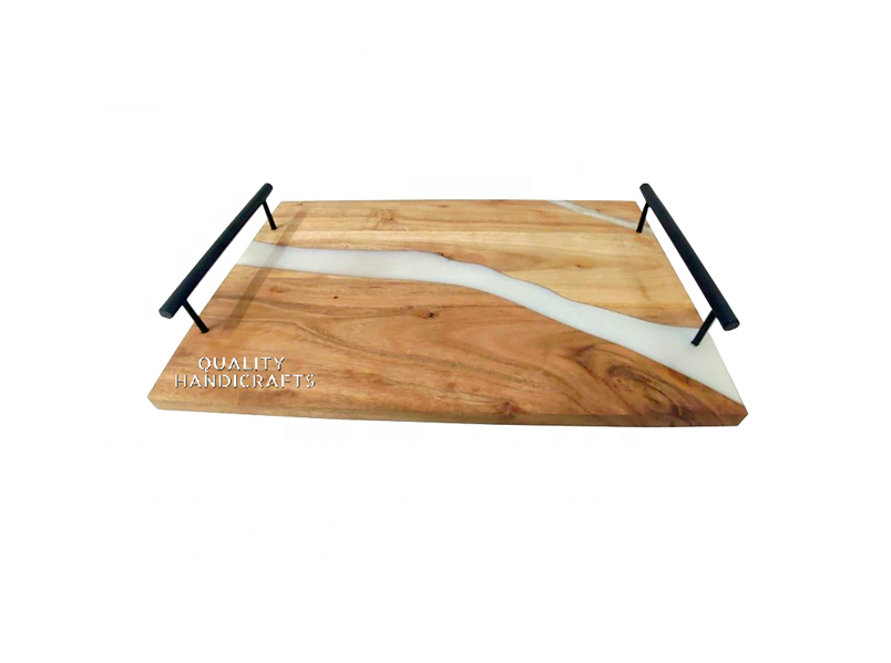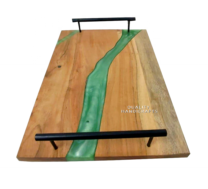 ถาดเสิร์ฟไม้ทำจากเรซินอีพ็อกซี่งานไม้แม่น้ำทำมือถาดศิลปะเรซิ่นสีน้ำเงินเข้มจากอินเดีย