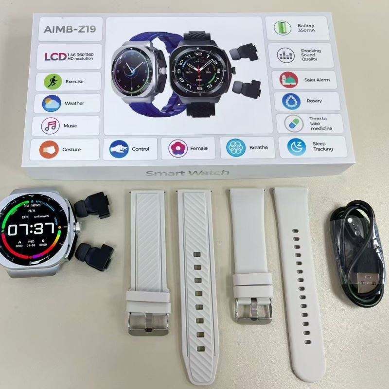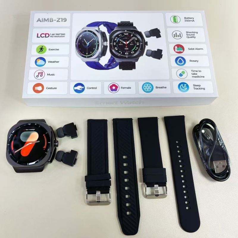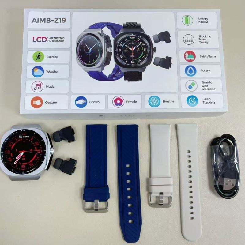 สมาร์ทวอทช์รุ่นใหม่ขายดี AIMB-Z19 รองรับการโทรผ่านบลูทูธ วัดอัตราการเต้นของหัวใจ หูฟังคู่ในตัว วัสดุไทเทเนียมอัลลอยด์ 2 in 1 นาฬิกาอัจฉริยะ TWS