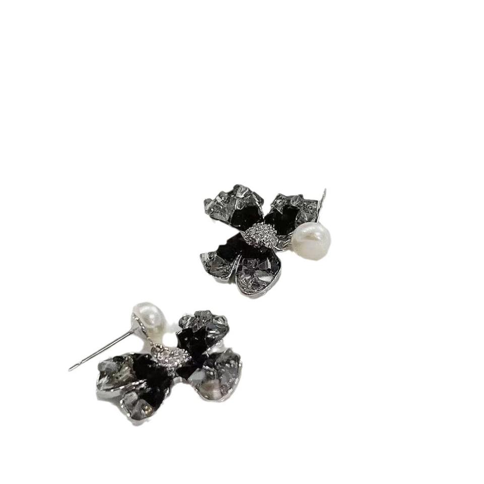ต่างหูคริสตัลสีดำใหม่ รุ่น Night Iris ประดับมุกน้ำจืดธรรมชาติ 8-9 มม. ตัวต่างหูเงินแท้ ไล่เฉดสีดำ-เทา แฟชั่น