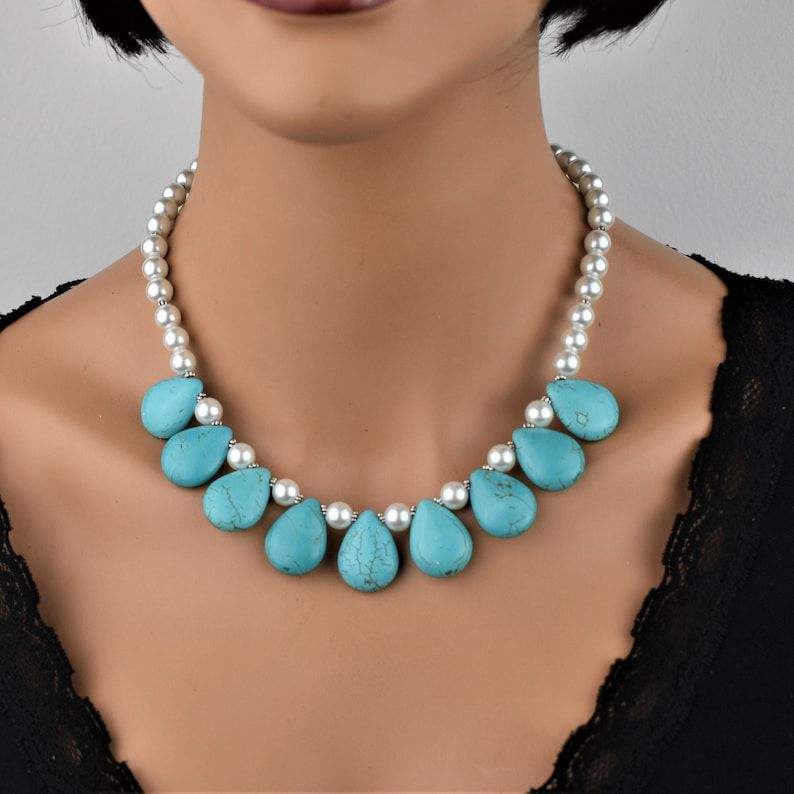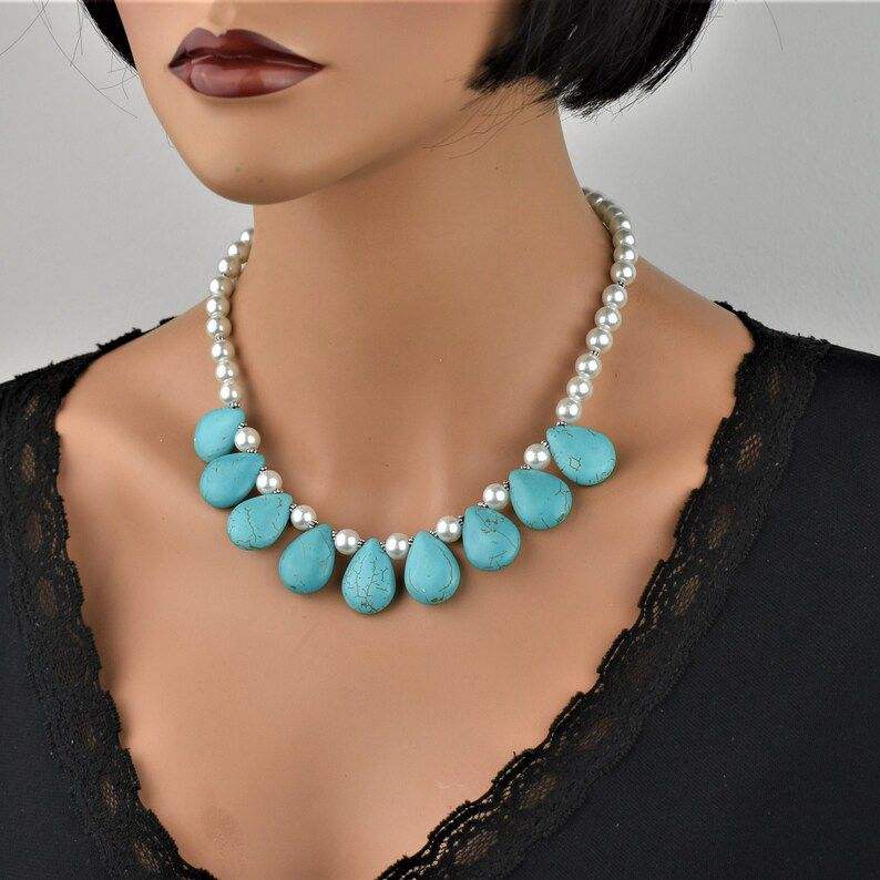 สร้อยคอหรูหราสไตล์โบฮีเมียนใหม่สำหรับผู้หญิงจี้ลูกปัดประกบสีเทอร์ควอยซ์ธรรมชาติเครื่องประดับที่สมบูรณ์แบบสำหรับคลาสสิก