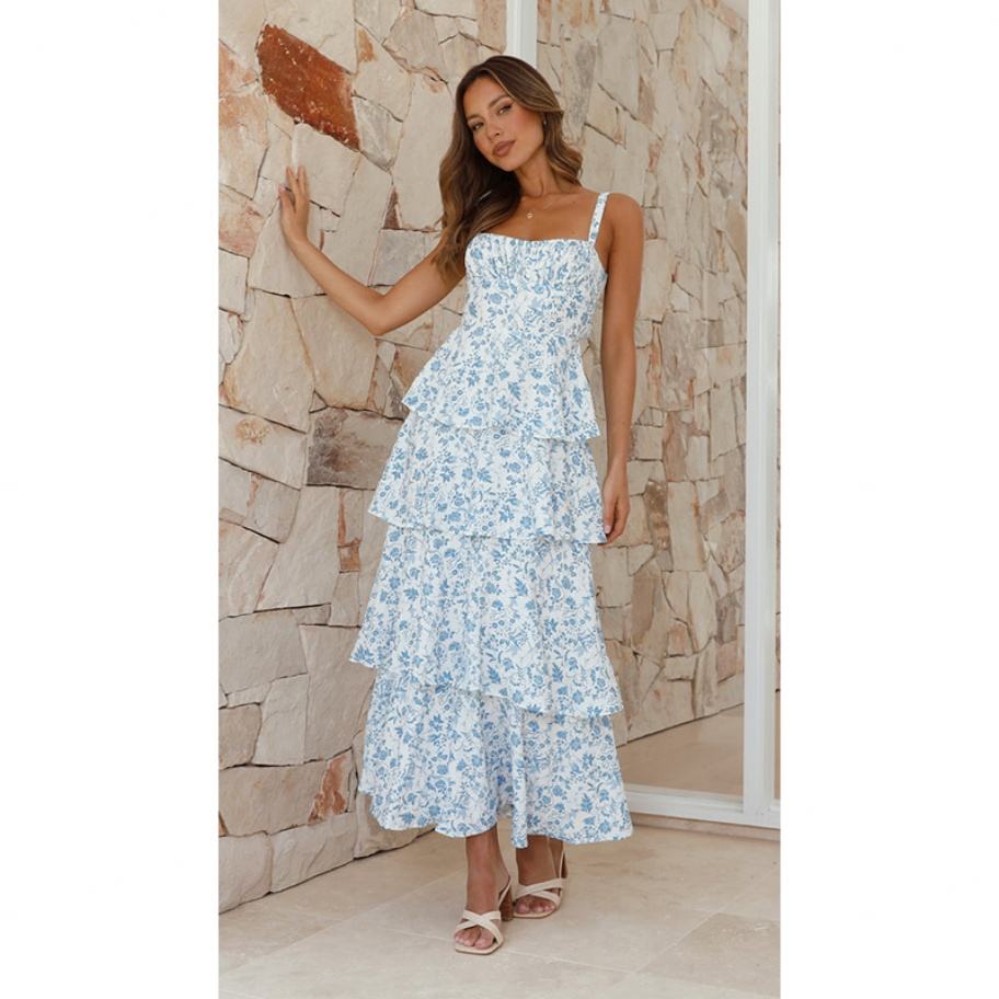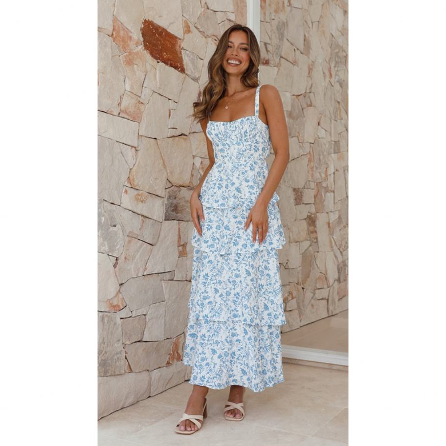 เดรสยาวสไตล์โบฮีเมียนลำลองสำหรับฤดูใบไม้ผลิและฤดูร้อน ปักลายดอกไม้เล็กๆ สายรัดระบาย ผ้าสแปนเด็กซ์ ซับในถักลายธรรมชาติ