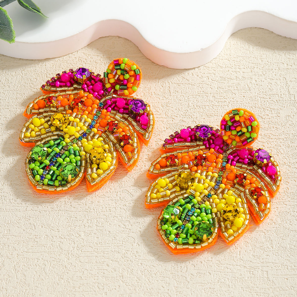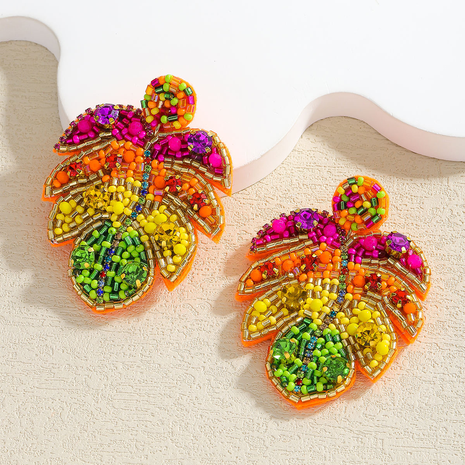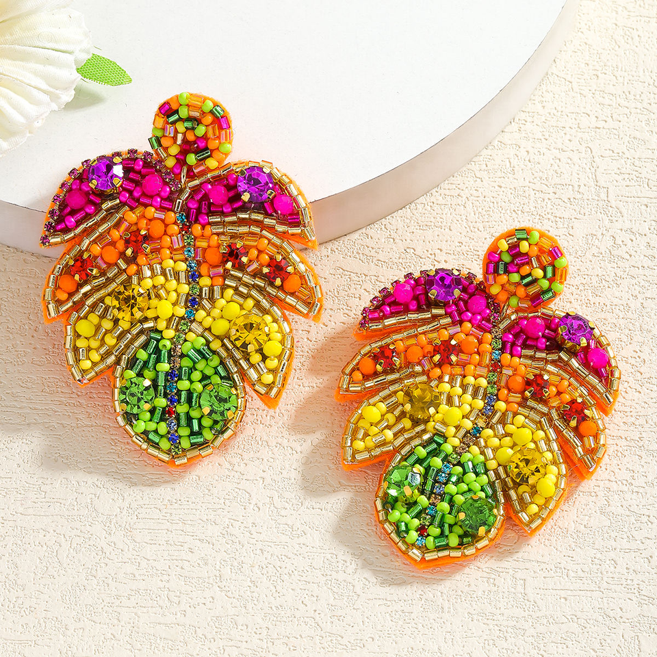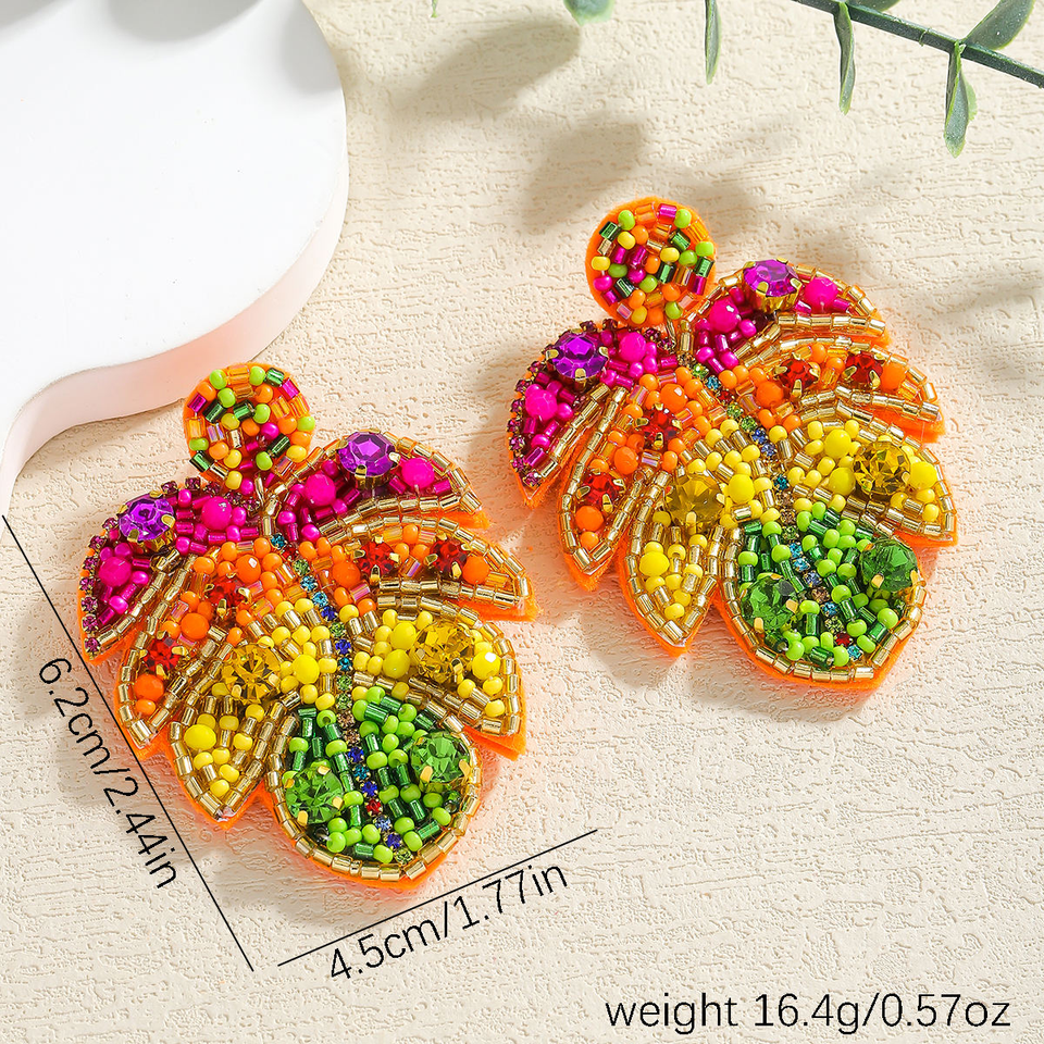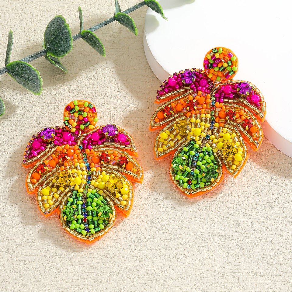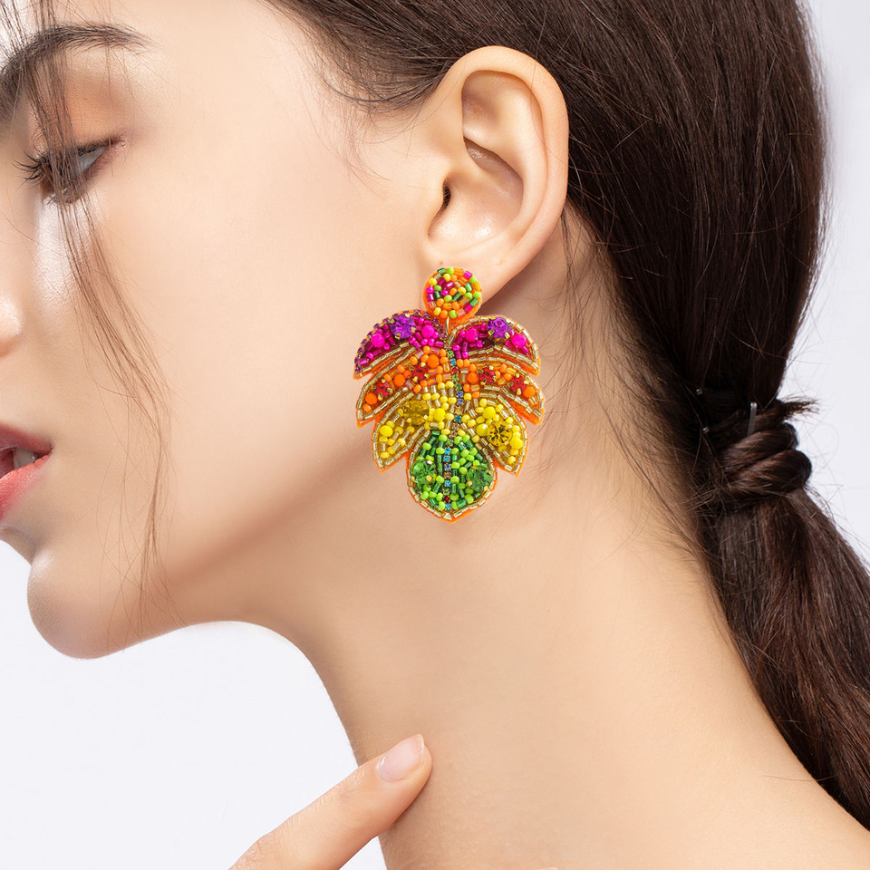 ต่างหูทำมือสไตล์โบฮีเมียนสีสันสดใสประดับลูกปัดรูปใบไม้เขตร้อนและเม็ดข้าวหลากสี โดย MD HANDICRAFTS