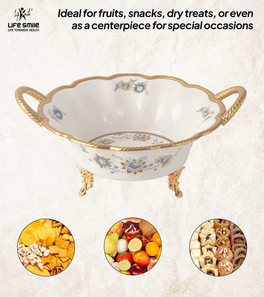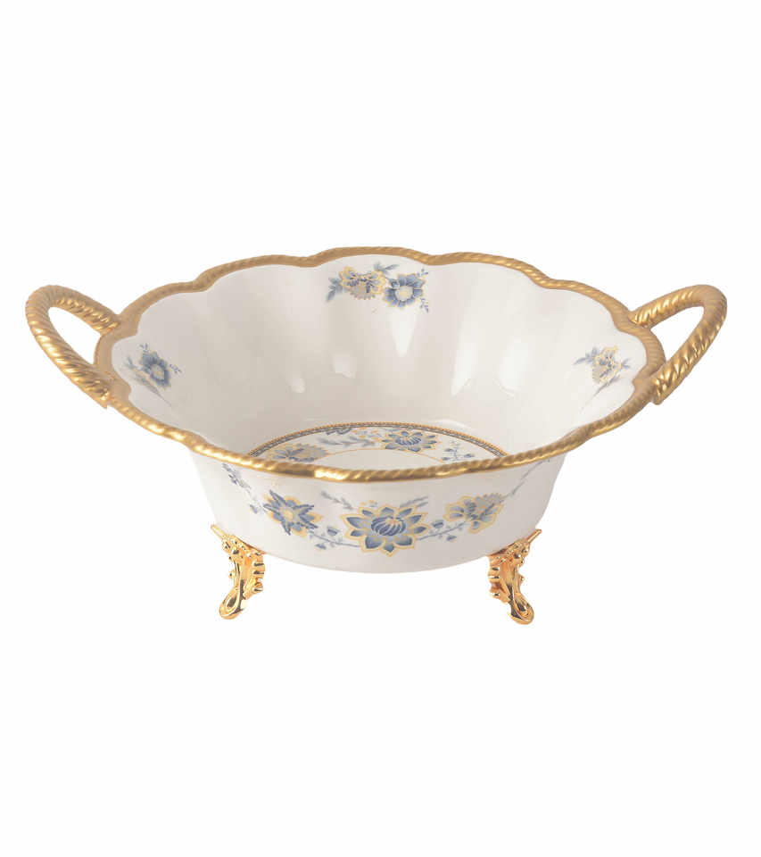 New Bone China Serving Dish Fruit Bowl White Color with Golden Stands & handles luxurious Design for Party and Gift