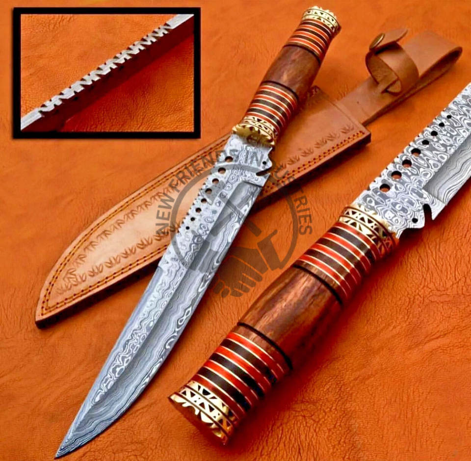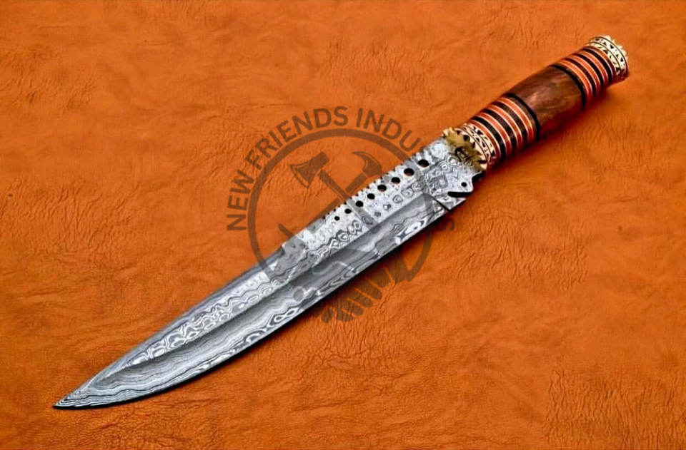 มีดโบวี่เหล็กดามัสกัสทำมือแบรนด์ใหม่ ด้ามไม้ทองเหลือง มีดล่าสัตว์ มีดเอาตัวรอด มีดสะสม ใบมีดคมคงที่