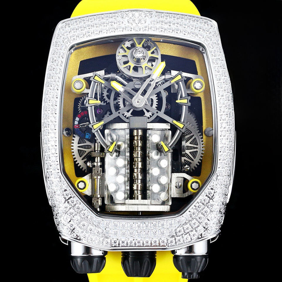 นาฬิกาข้อมือดีไซน์รถสปอร์ตสีน้ำเงินรุ่นใหม่ ประดับเพชรโมอิสซาไนต์ ขอบหน้าปัดเงินแบบโปร่งใส พร้อมกลไกตูร์บิญองไขลานอัตโนมัติ
