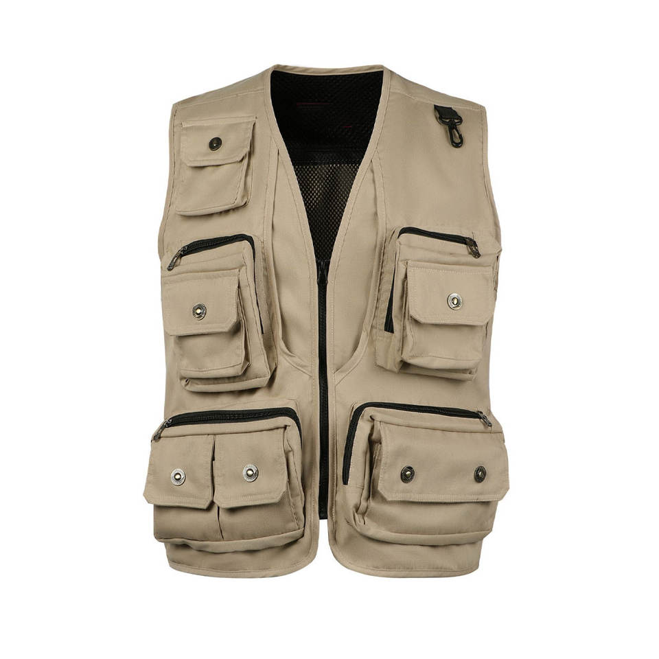 ใหม่เสื้อกั๊กกันหนาวแบบมีซิปมีกระเป๋ามีกระดุมสำหรับผู้ชายเสื้อกั๊กตกปลาของผู้ชายทำจากผ้าฝ้ายโพลีเอสเตอร์
