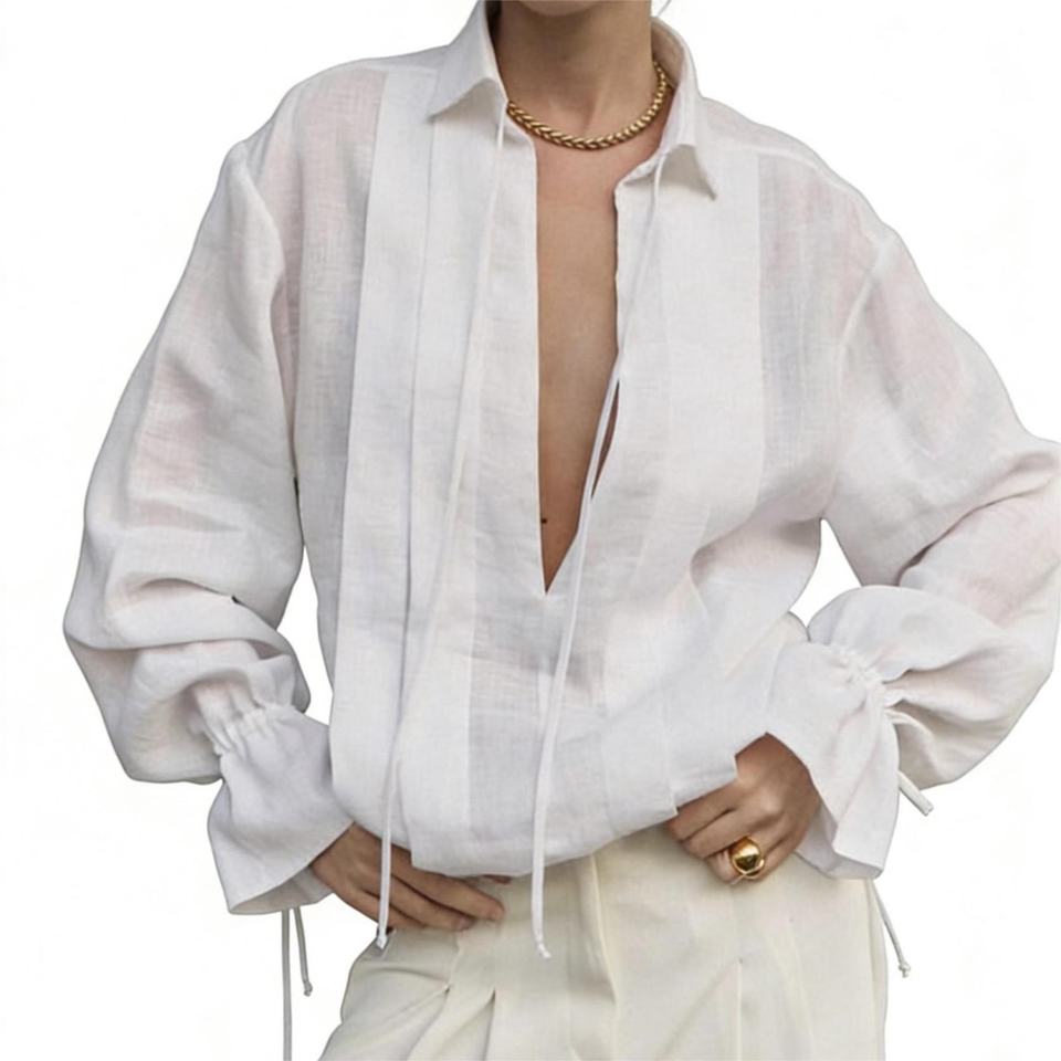 เสื้อเชิ้ตผ้าลินินสไตล์วินเทจลำลองแบบใหม่ ระบายอากาศได้ดี ทรงปกติสำหรับผู้หญิง ติดกระดุมด้านหน้า แขนยาวทรงโคมไฟ ดีไซน์ปกเสื้อ