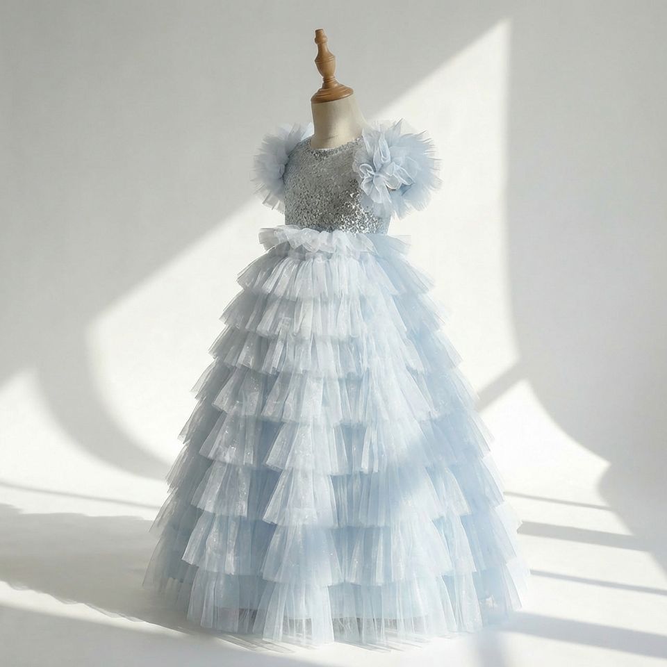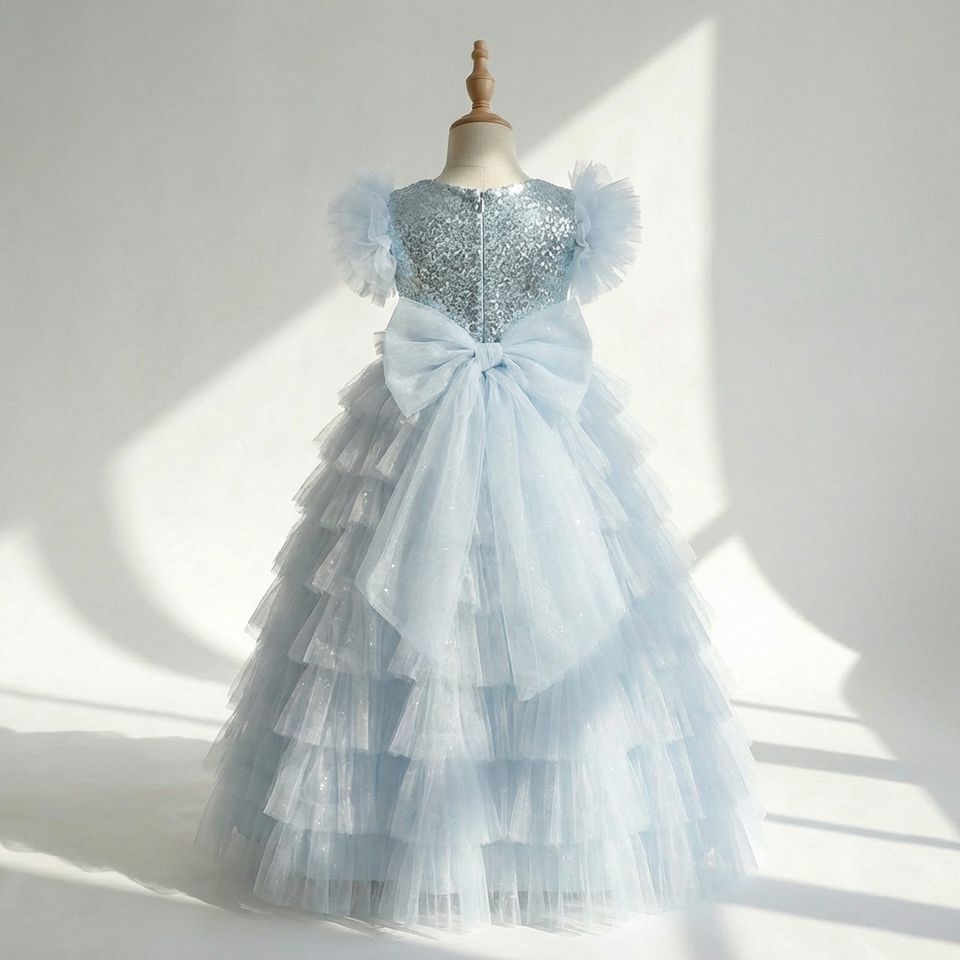 ชุดราตรีเด็กผู้หญิงสีน้ำเงินประดับเลื่อมแบบใหม่ ดีไซน์หรูหราสำหรับงานแต่งงานฤดูร้อน ชุดเพื่อนเจ้าสาว