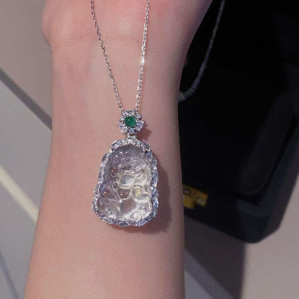 พระพุทธรูปหัวเราะ พระอาระห์ วัสดุธรรมชาติจากจีน วัสดุอันตราย น้ำเงิน ประดับเงินแท้ S925 ฝังมรกตน้ำแข็ง