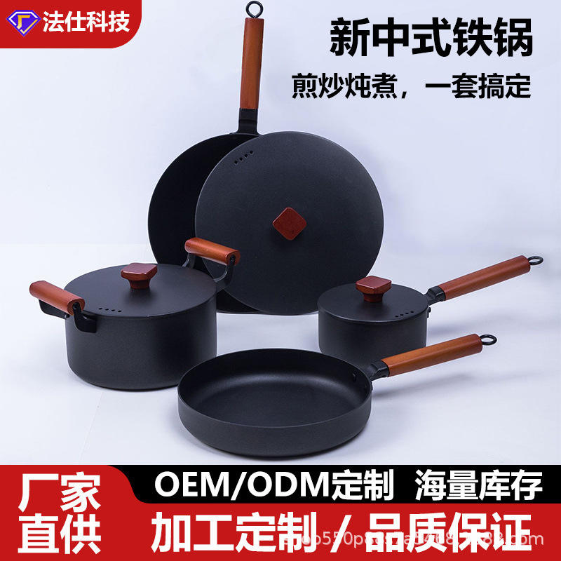 ชุดเครื่องครัวเหล็กสไตล์จีนแบบใหม่ กระทะเคลือบกันติด หม้อซุป กระทะทอด ชุดเครื่องครัวก้นแบนสำหรับใช้ในครัวเรือน