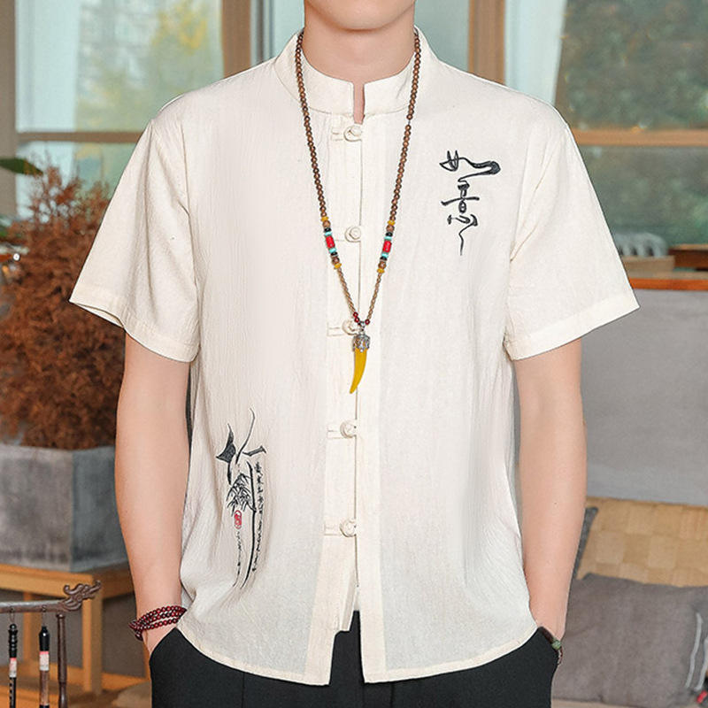 เสื้อผู้ชายสไตล์จีนแบบใหม่ ชุดถังผ้าลินิน แขนสั้น สีพื้น แบบดั้งเดิม ชุดกังฟูสไตล์จีน ฮันฟู เสื้อคอจีน