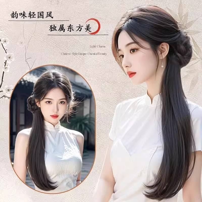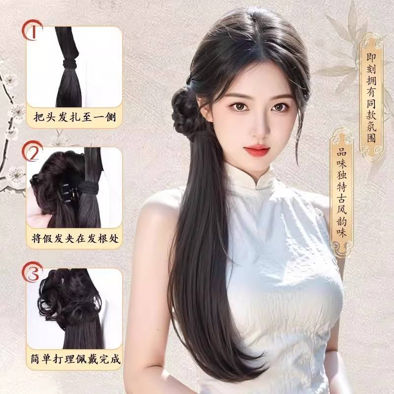 วิกผมทรงหางม้าสไตล์จีนแบบใหม่ ทำจากเส้นใยทนความร้อน พร้อมกิ๊บติดผมถักเปียด้านข้าง สำหรับชุดฮั่นฝูและกี่เพ้า
