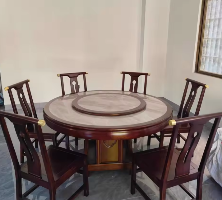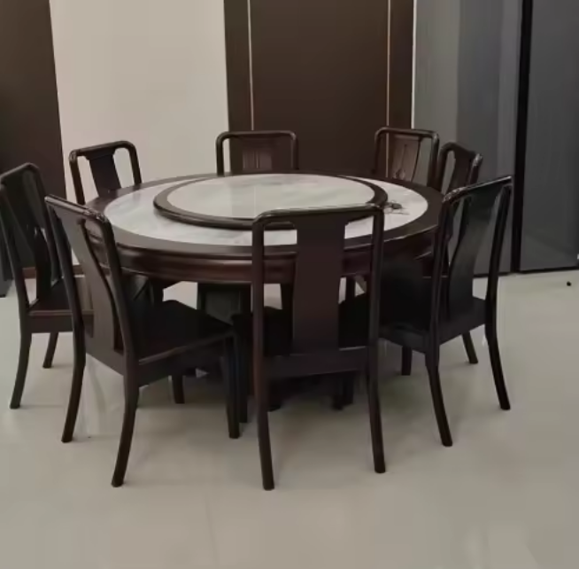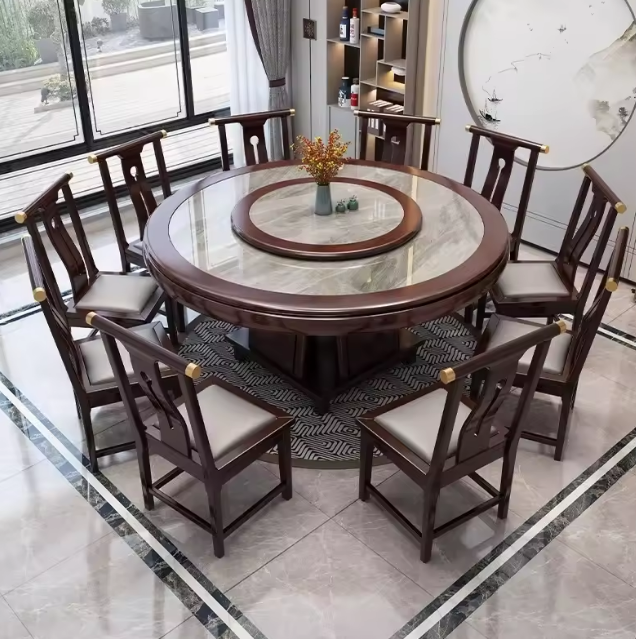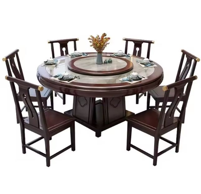 โต๊ะรับประทานอาหารทรงกลมหินแกรนิตสไตล์จีนแบบใหม่พร้อมเก้าอี้ โต๊ะรับประทานอาหารไม้เนื้อแข็งแบบหมุนได้สำหรับใช้ในบ้าน โรงแรมพร้อมโต๊ะหมุน