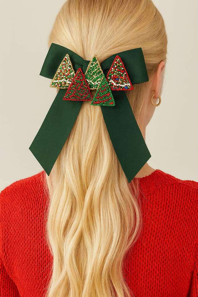 กิ๊บติดผมโบว์ผ้าซาตินขนาดใหญ่สำหรับเทศกาลคริสต์มาส งานแฮนด์เมด ประดับใบฮอลลี่และผลเบอร์รี่ อุปกรณ์เสริมสำหรับวันหยุด ริบบิ้นสีเขียวเข้มสุดหรู สำหรับมัดผมหางม้า