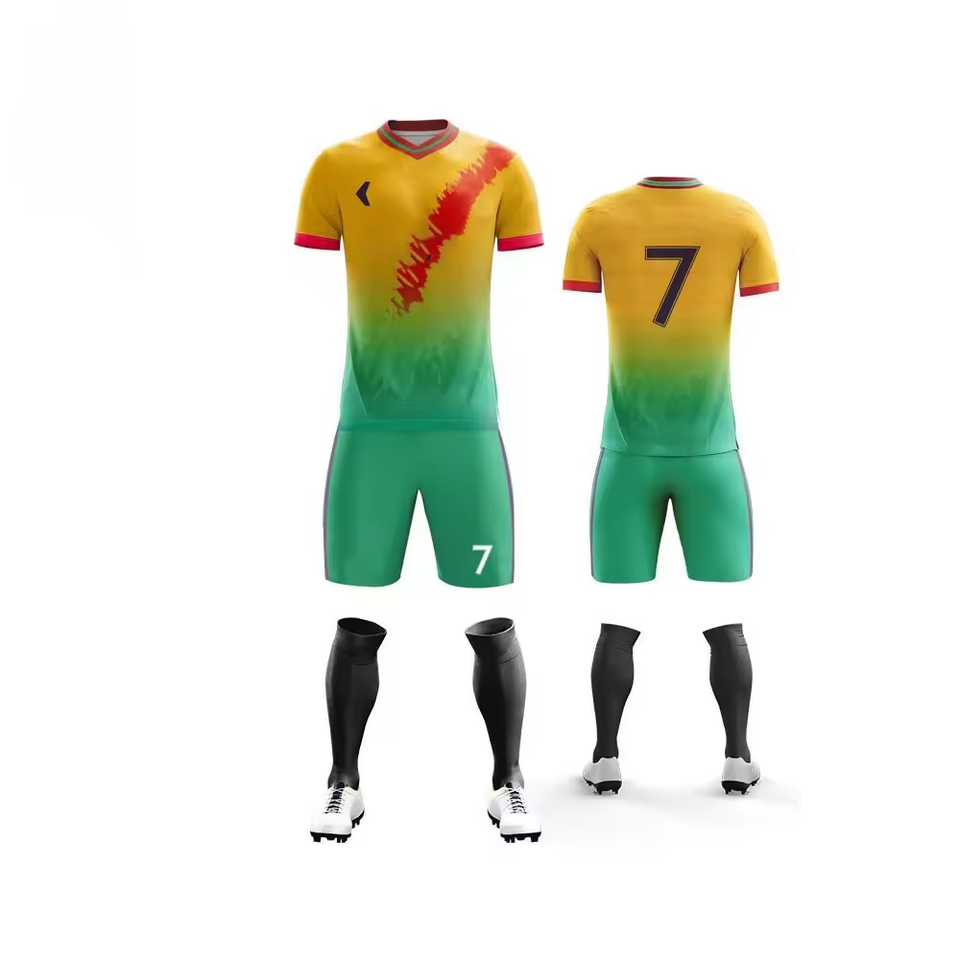 New Classic Light Weight Top Selling Soccer Uniform Sublimation Best Design 3 Multy Color Red Green and Yellow Sale Bulk