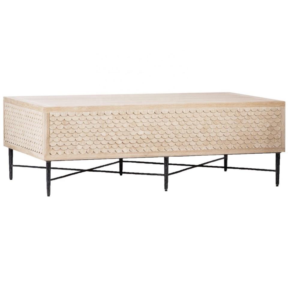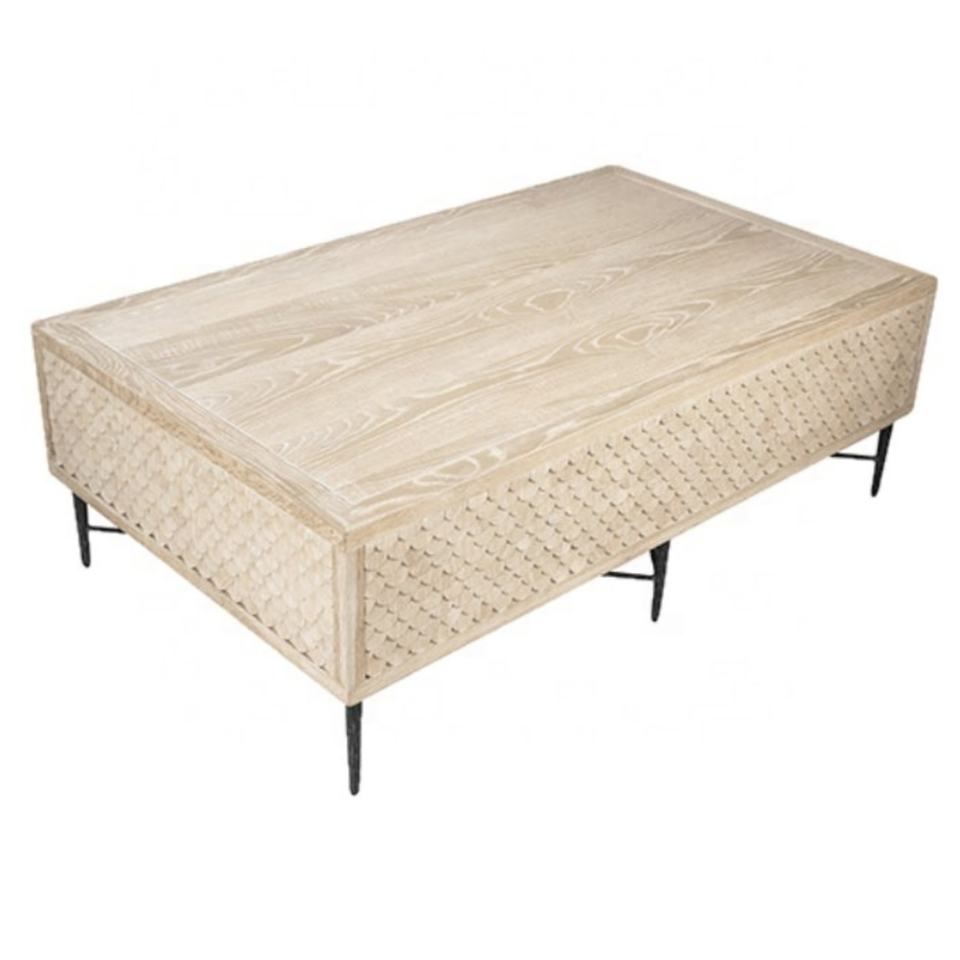 โต๊ะน้ำชาแบบคลาสสิกใหม่พร้อมไม้โอ๊คแข็งแรงทนทานพร้อมลวดลายบนฐานเหล็กดัด โต๊ะกลางห้องนั่งเล่นแบบเตี้ย