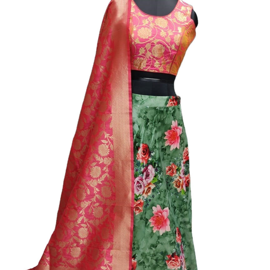 ชุดสีพิมพ์ดิจิตอลผ้าซาติน lehenga พิมพ์ลายดอกไม้ทันสมัยพร้อมผ้าไหมแท้ dupatta และเสื้อขนาดพิเศษสำหรับเจ้าสาว