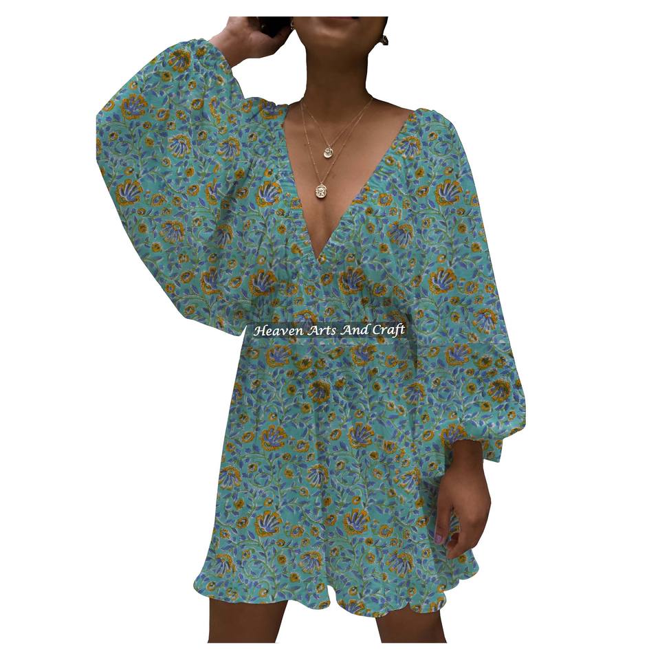 ผ้าฝ้ายใหม่ขายดี ดีไซน์หรูหรา เหมาะสำหรับงานแต่งงาน งานเลี้ยงฤดูร้อน ลายพิมพ์บล็อกด้วยมือ สไตล์ลำลอง คอวีลึก ขายดี