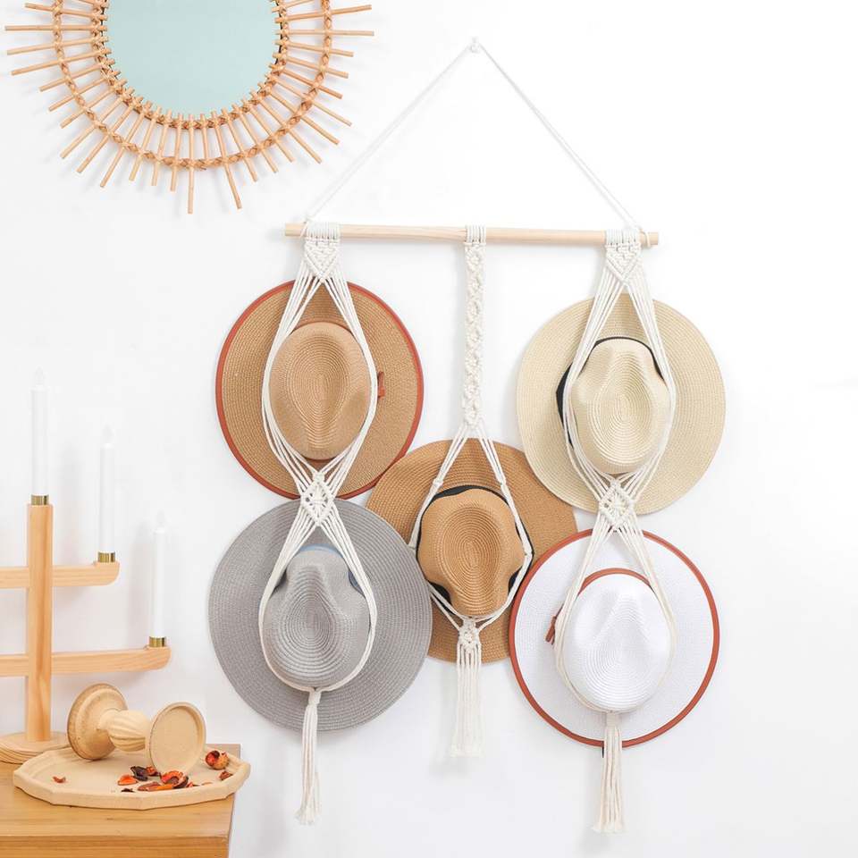พรมแขวนผนังทำจากผ้าฝ้ายเชือกทอมือใหม่ราวแขวนหมวกแขวนผนังสำหรับห้องแขวนหมวกเชือกสไตล์นอร์ดิก