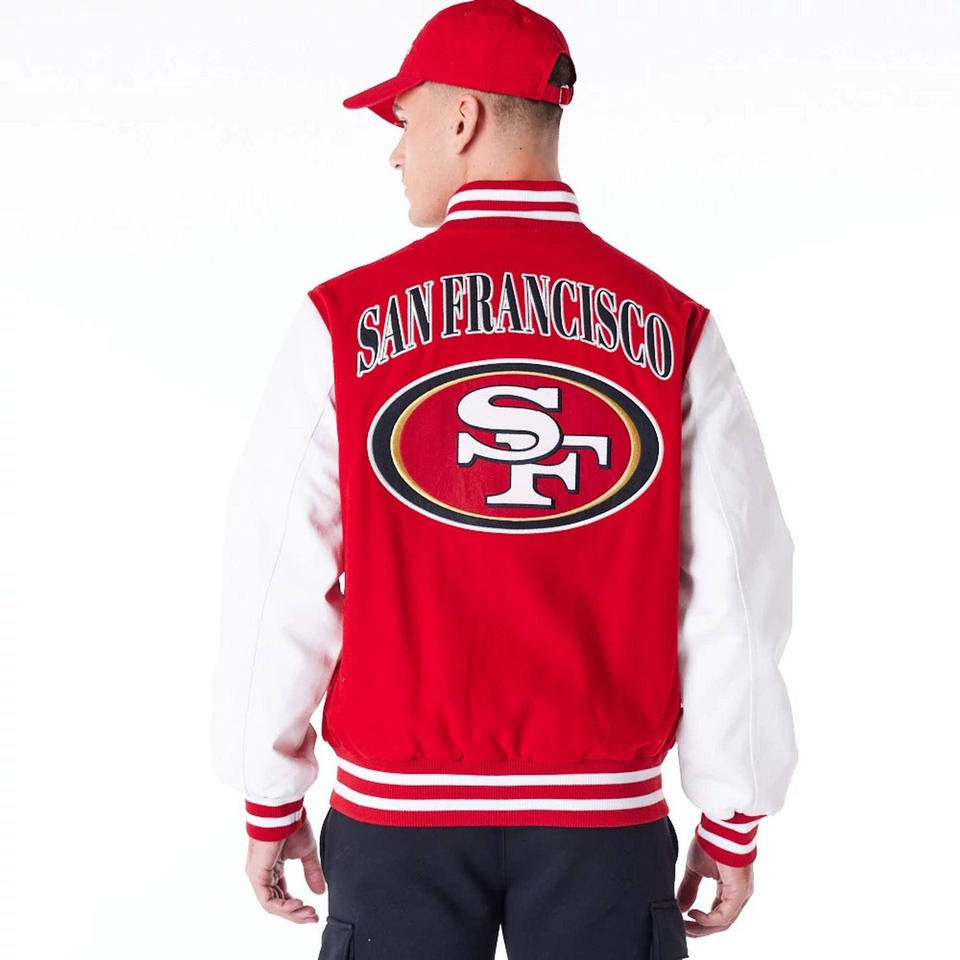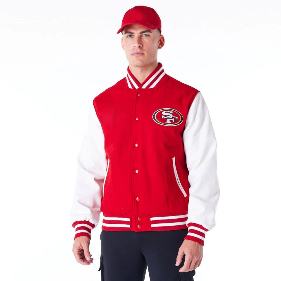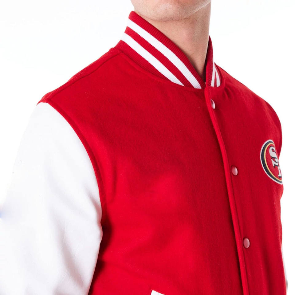 แจ็กเก็ตเบสบอลขนสัตว์สีแดงและสีดำมีกระดุมปิดด้านในมีกระเป๋า
