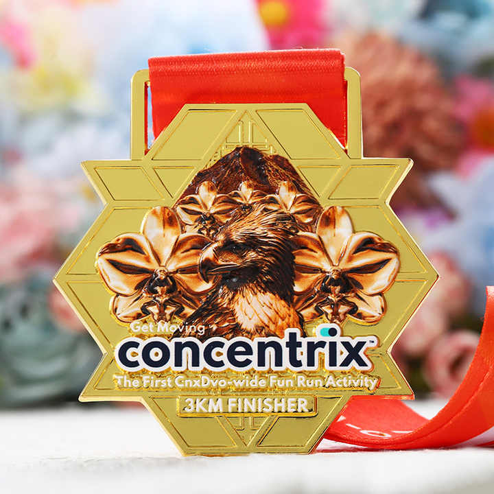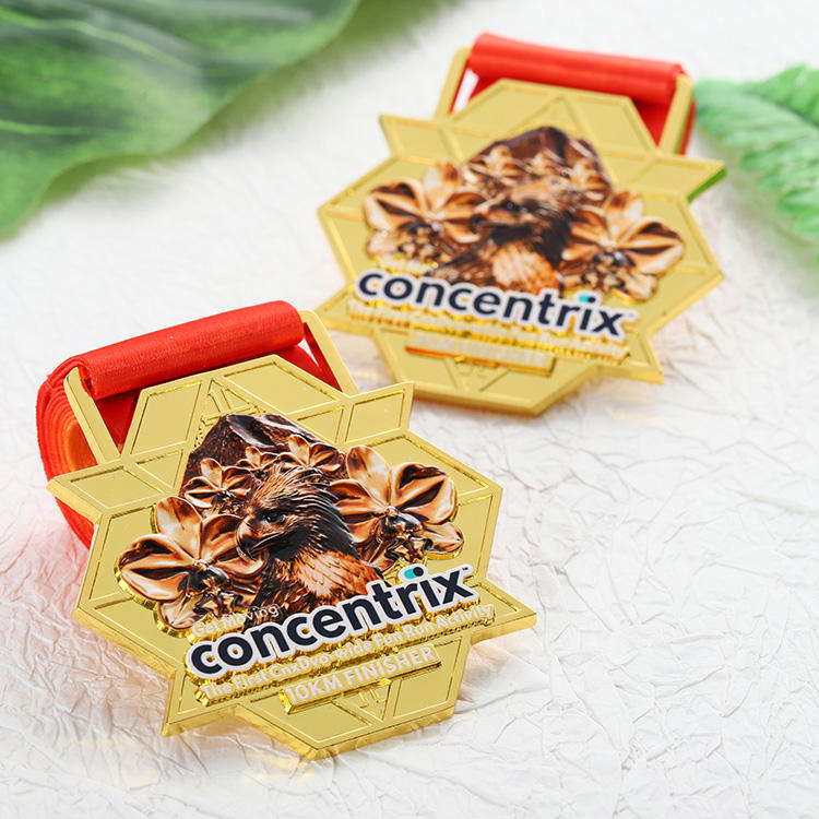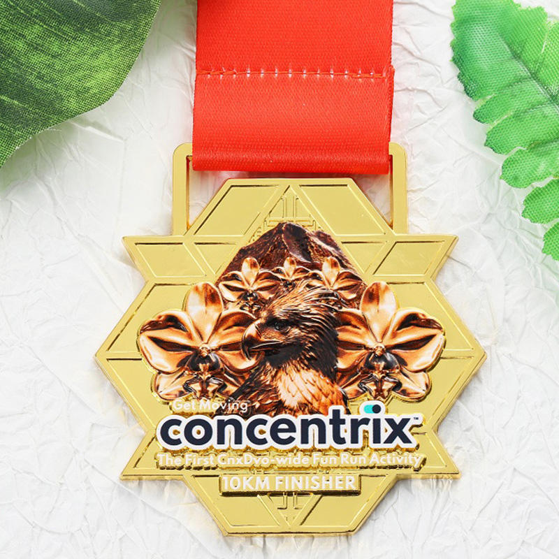เหรียญรางวัลแบบกำหนดเองใหม่ ดีไซน์ 3 มิติ รูปนกอินทรี ภูเขา และกล้วยไม้ ชุบทอง รูปทรงหกเหลี่ยม 10 กม. สำหรับนักวิ่งในงานวิ่งเพื่อความสนุกสนาน