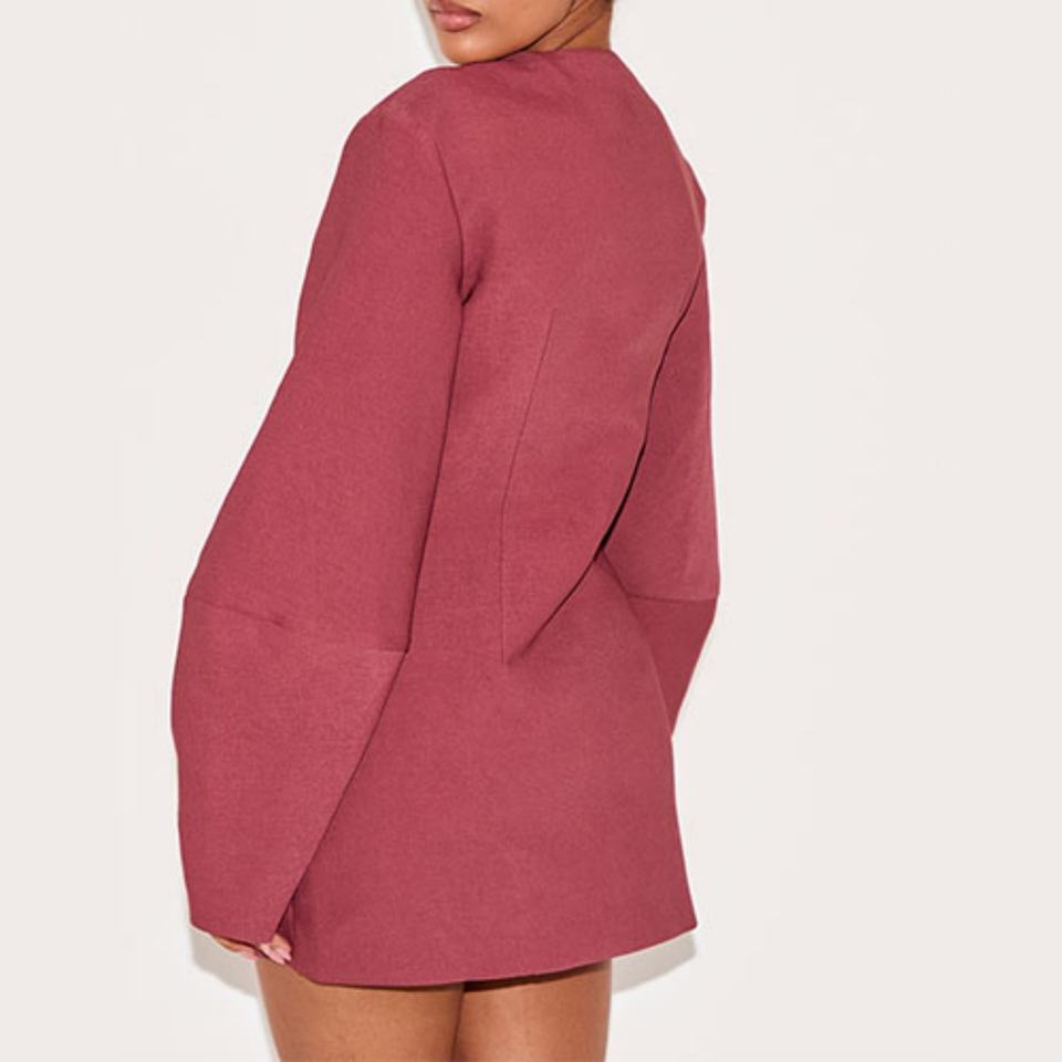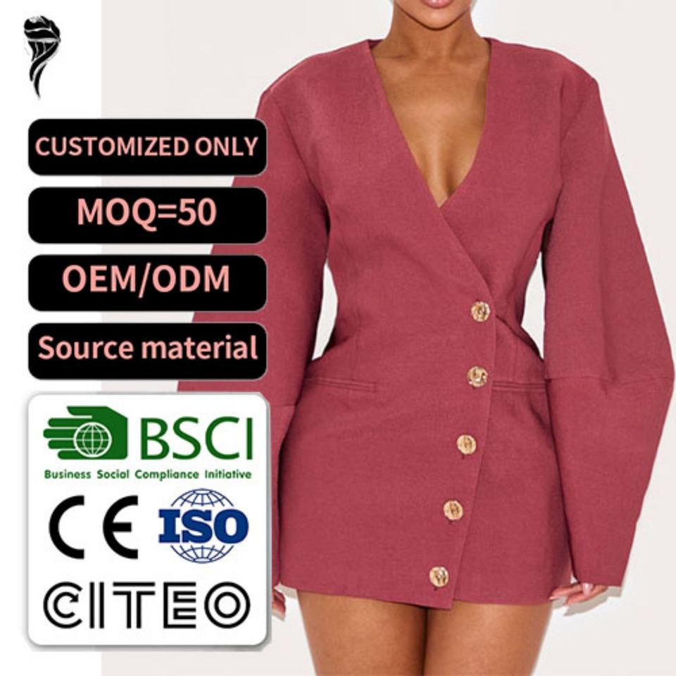 เดรสสั้นทรงสวยหรูสำหรับผู้หญิง แขนยาว คอวีลึก ติดกระดุม ทรงบ็อกซี่ สไตล์ใหม่ รับผลิตแบบ OEM ODM