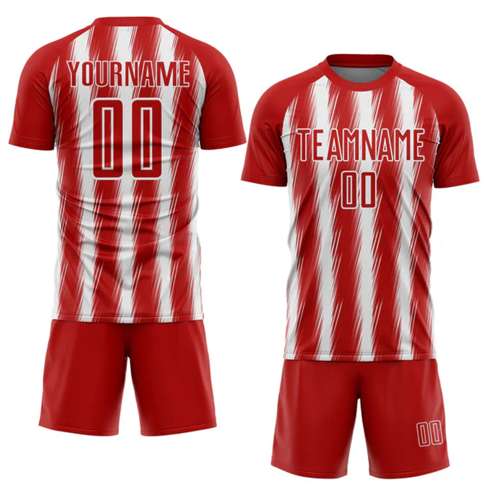 ชุดฟุตบอลแบบกำหนดเองใหม่ ลายทางสีน้ำเงินแดง พิมพ์ลายดิจิทัล ผ้าระบายอากาศ แห้งเร็ว 220GSM ชุดฟุตบอลสั่งทำพิเศษ