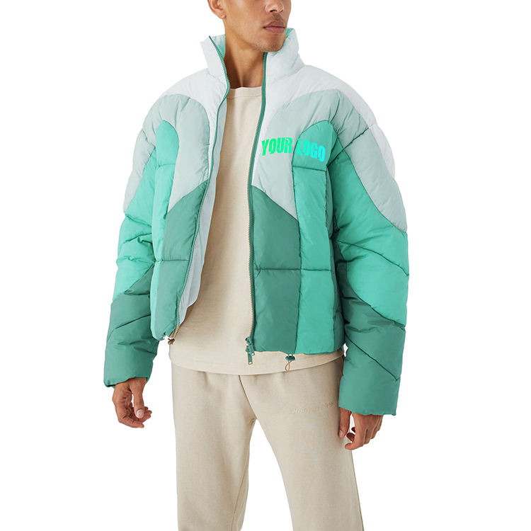 แจ็คเก็ตผ้าแคนวาสทรงพัฟเฟอร์แบบใหม่สำหรับผู้ชาย คอตั้ง พร้อมโลโก้ด้านหน้า ขายส่ง แจ็คเก็ตกันน้ำคุณภาพสูงสำหรับฤดูหนาว