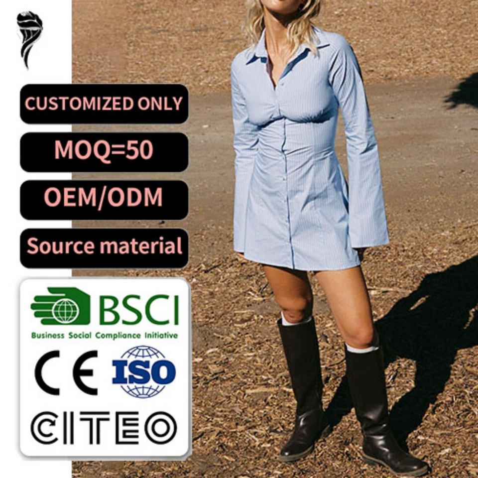 เดรสสั้นแขนยาวทรงบานสไตล์ใหม่สำหรับผู้หญิง แต่งลายทาง ติดกระดุมด้านหลัง ปรับเอวได้ด้วยเชือกผูก