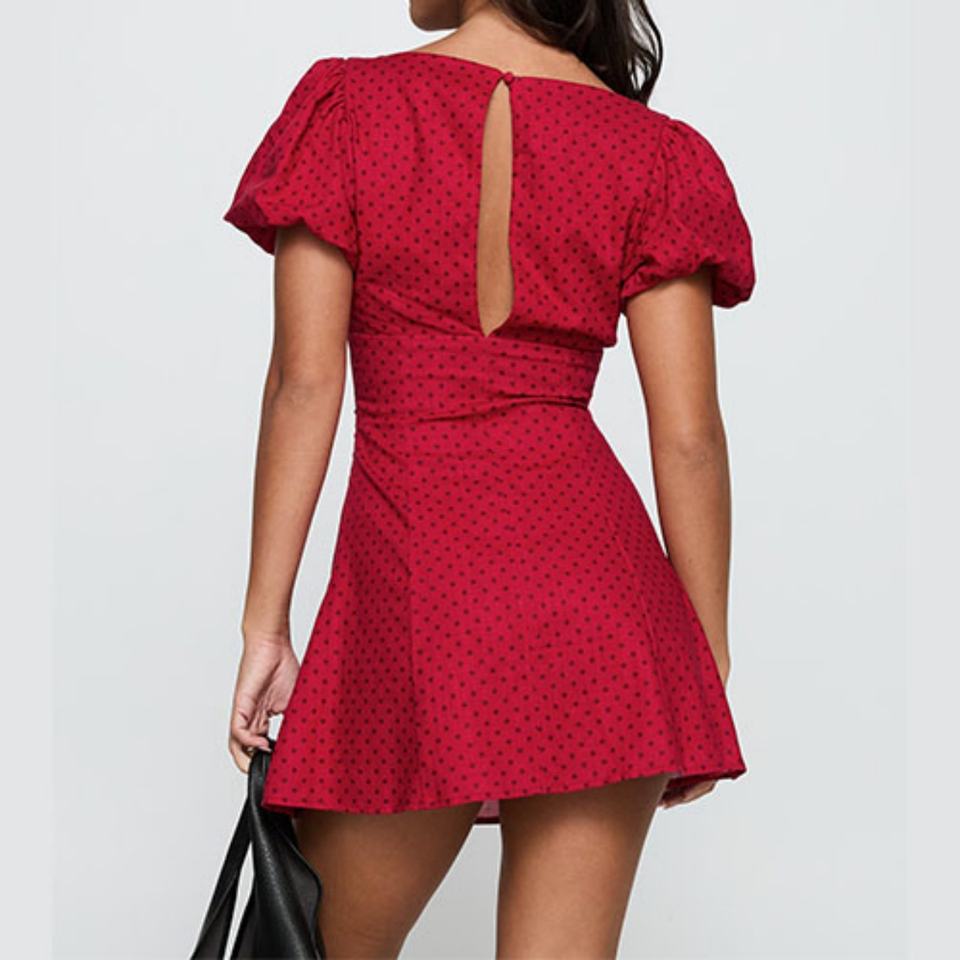 เดรสสั้นผู้หญิงแบบใหม่ แต่งลูกไม้เว้าคอวี เซ็กซี่ แขนพองสั้น สีแดง ผ้าฝ้ายเนื้อนุ่ม ลายจุด เหมาะสำหรับงานปาร์ตี้ริมชายหาด