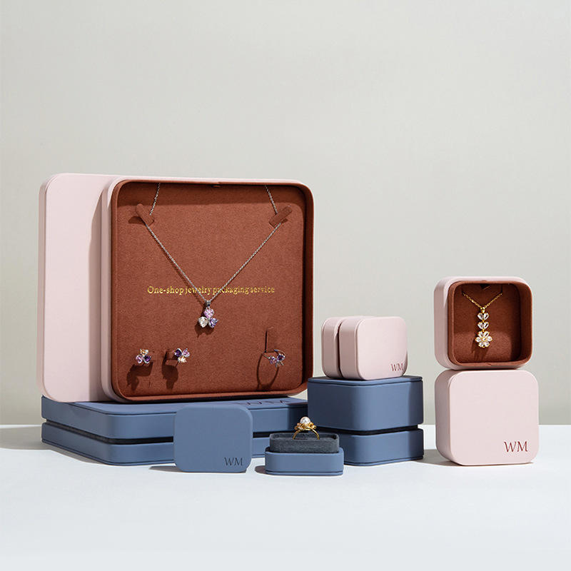 กล่องใส่เครื่องประดับทรงสี่เหลี่ยมสีฟ้าชมพู บุด้วยกำมะหยี่ หนัง PU คุณภาพสูง พร้อมโลโก้สั่งทำพิเศษ สำหรับเก็บแหวน สร้อยคอ ต่างหู และกำไล